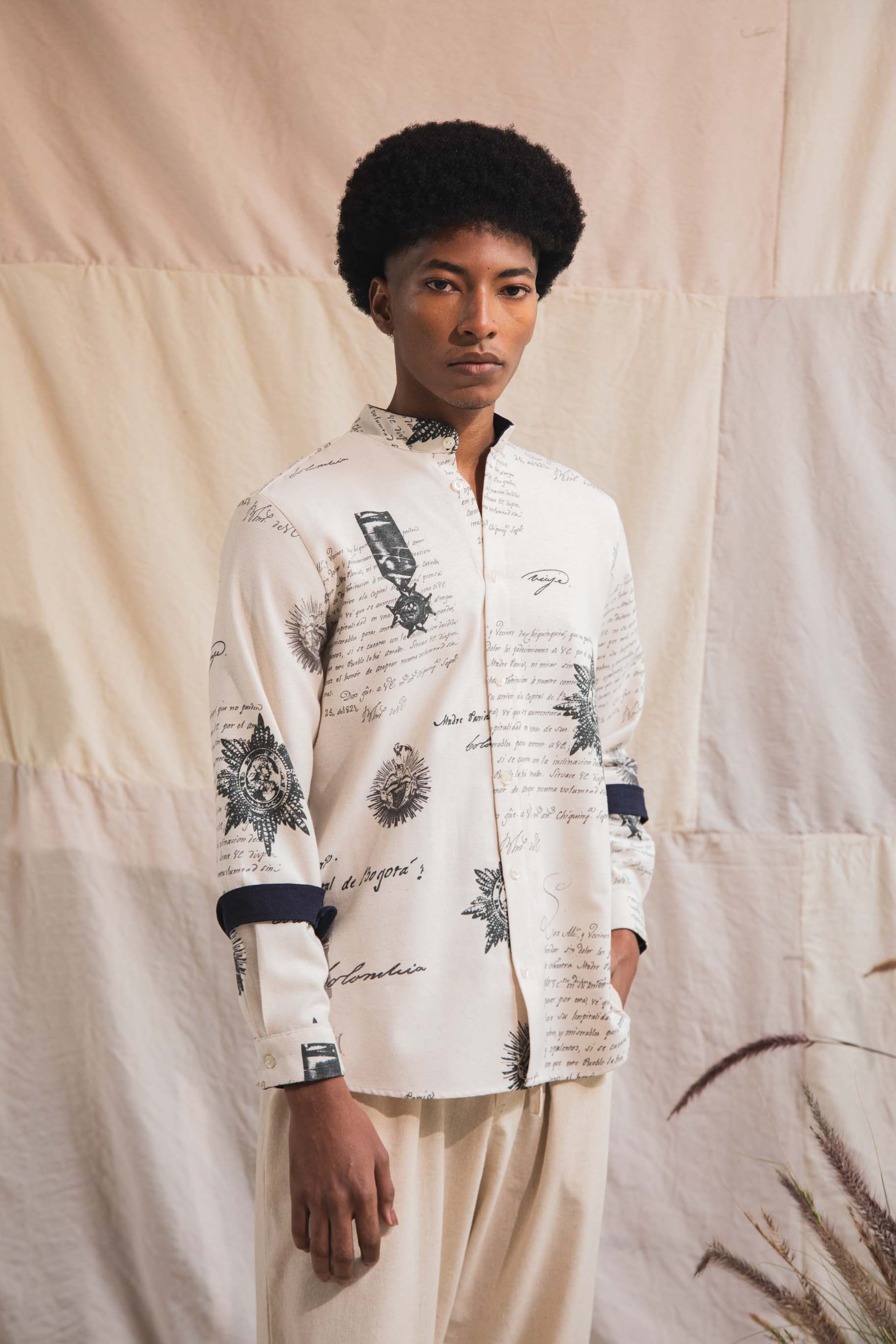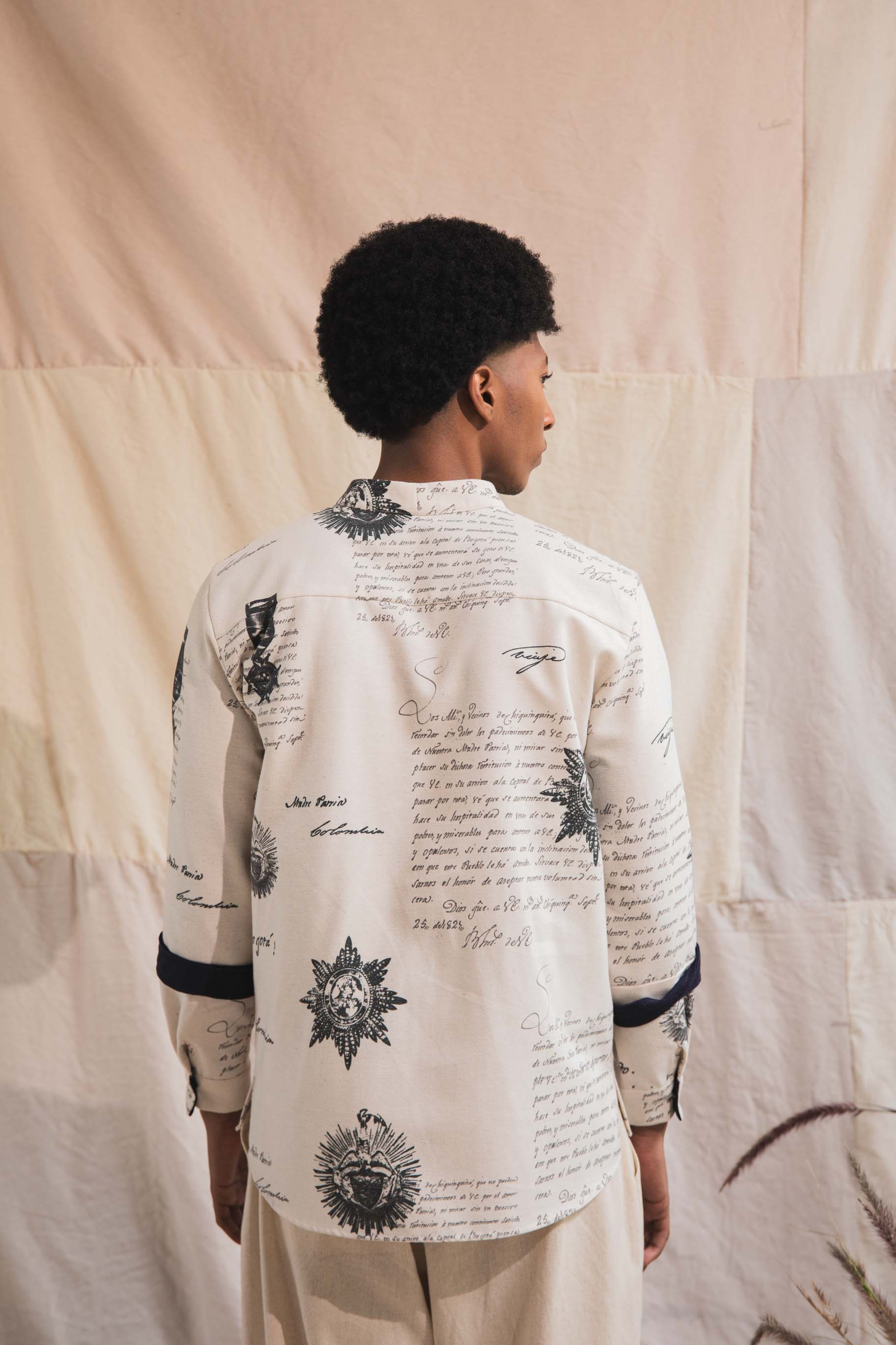 Camisa de botones manga larga con cuello nerú, fit cuadrado, y charreteras decorativas pequeñas alrededor de los antebrazos. Sublimada con nuestro patrón exclusivo de medallas y cartas.