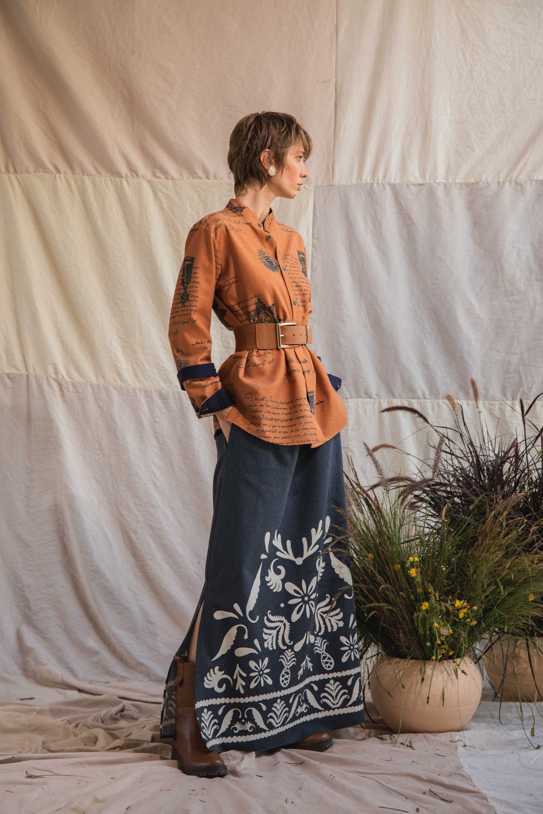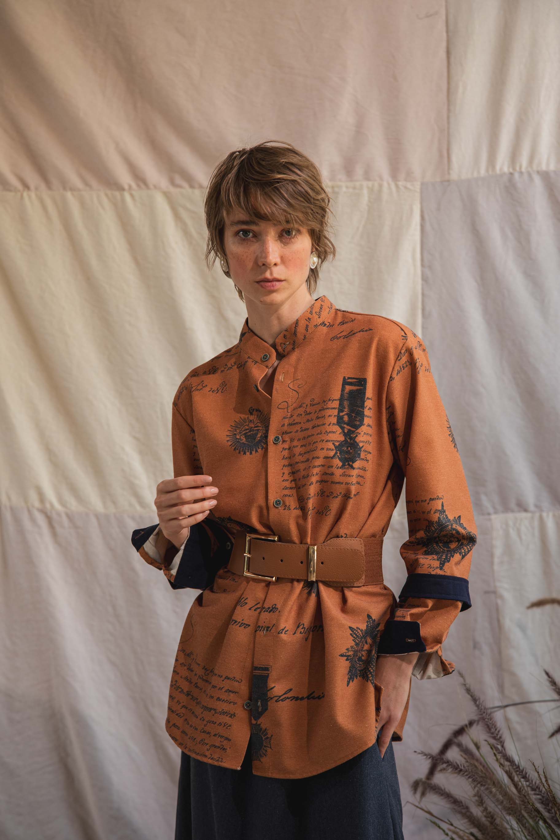 Camisa de botones manga larga con cuello nerú, fit cuadrado, y charreteras decorativas pequeñas alrededor de los antebrazos. Sublimada con nuestro patrón exclusivo de medallas y cartas.