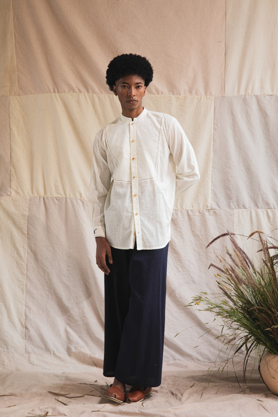 Camisa de botones y manga larga, con cuello Nerú, pechera decorativa y puños bordados.