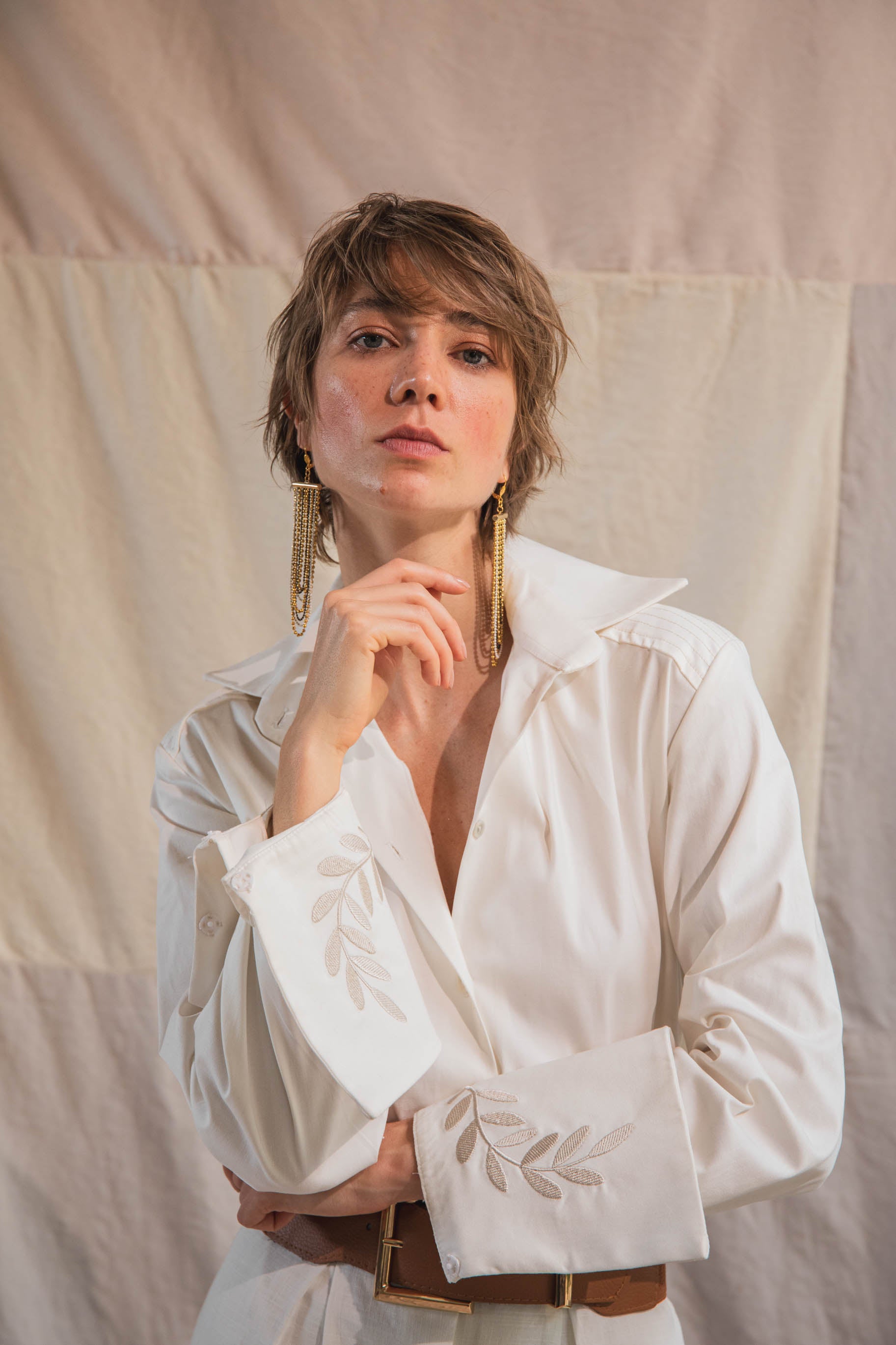 Camisa de botones con mangas largas y maxi puños que se doblan hacia el revés, bordados con motivo de ramas. Silueta recta, cuello clásico y estructura liviana.