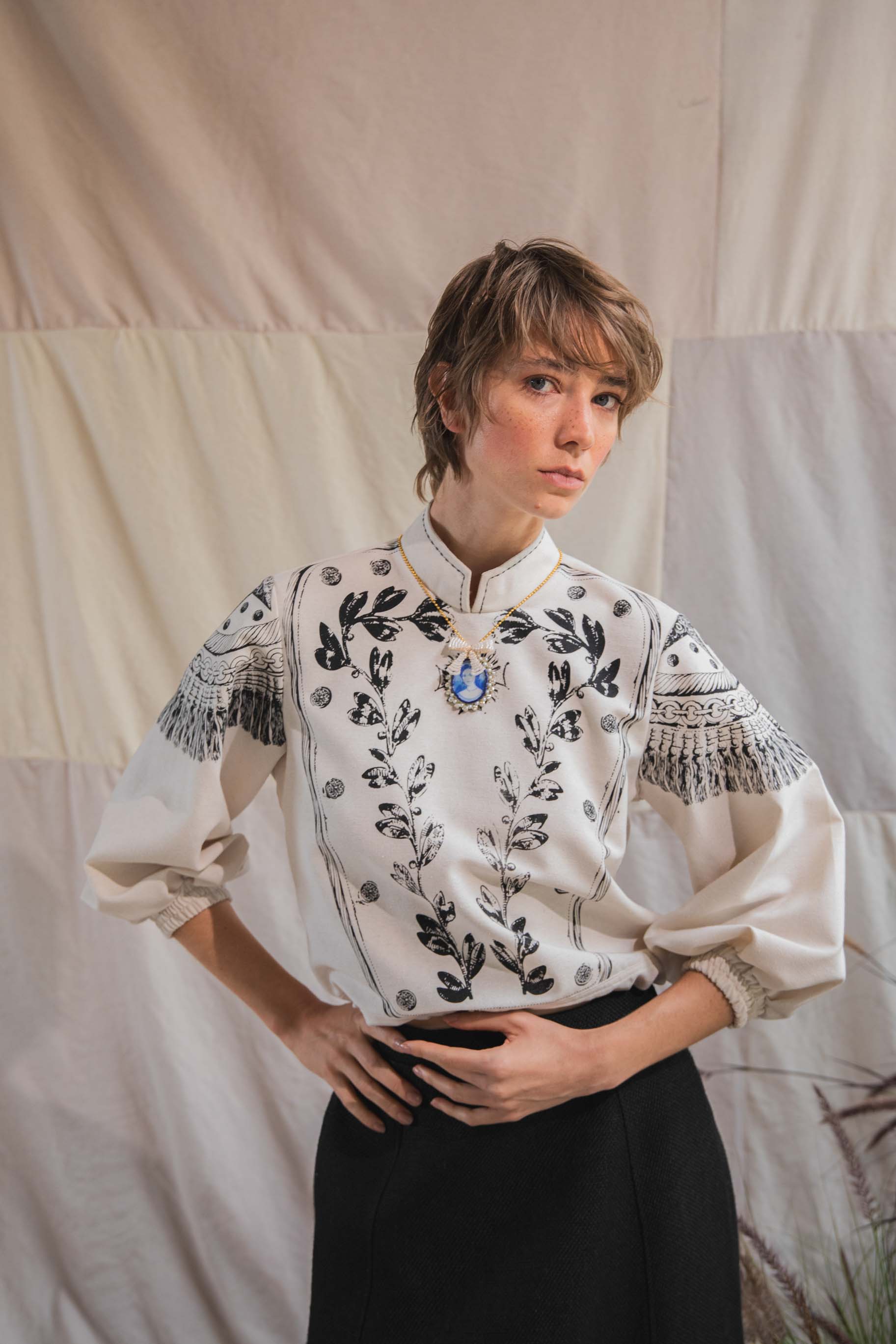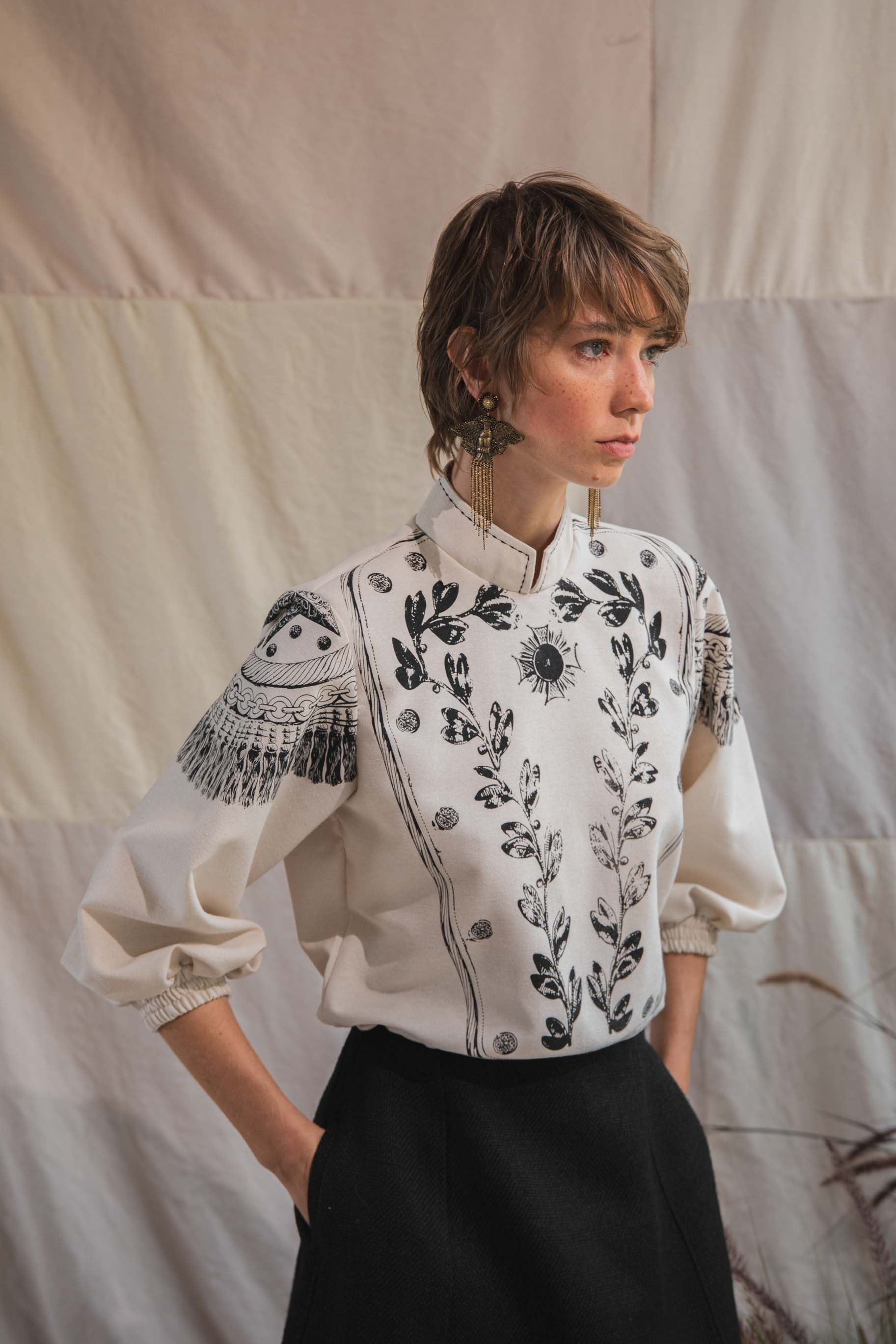 Camisa con cierre de botones forrados en la espalda, manga larga con manga bombacha con elástico, cuello nerú, y túnel con tira para ajustar en la cintura.