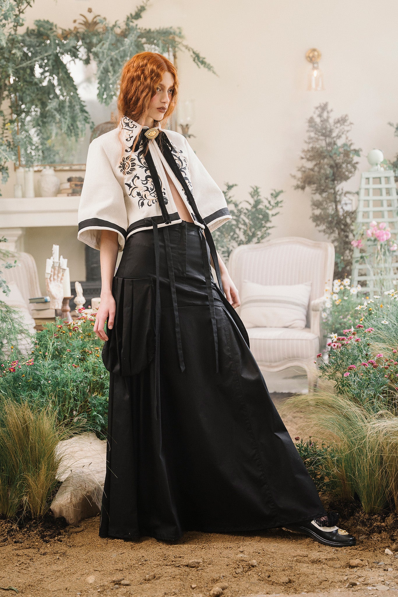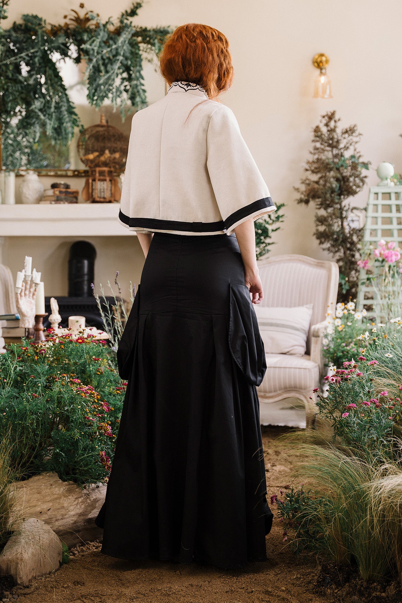 Falda larga en color negro de silueta estructurada. Se distingue por dos bolsillos exteriores de gran tamaño y cuenta con cinturón textil con ajuste en la cintura, aportando funcionalidad y definición a la prenda.