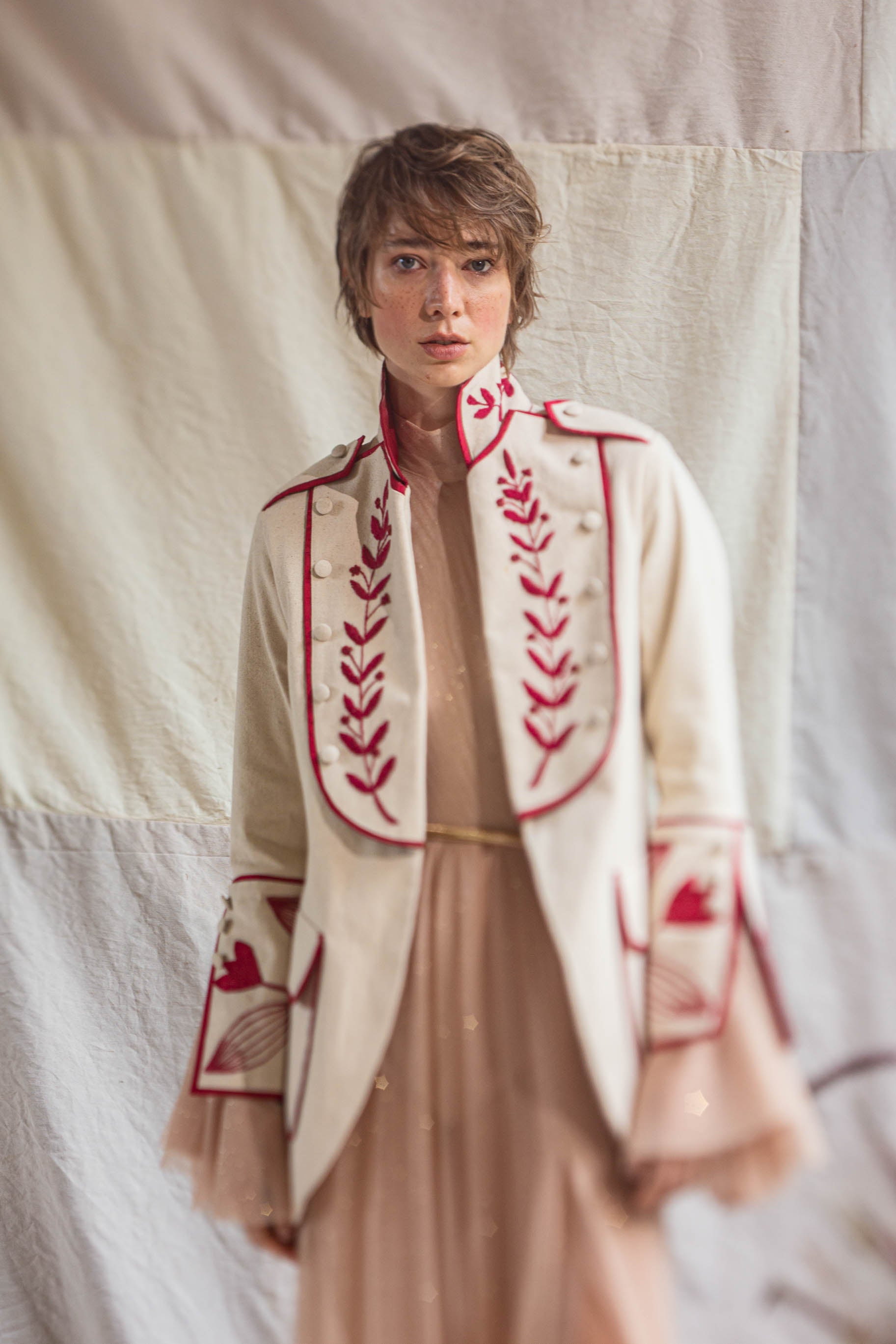 Chaqueta tipo hussar jacket o uniforme de gala militar ligero, con manga larga, botones forrados, bordados en el cuello, el pecho y las mangas, hombreras decorativas, charreteras en los hombros y bolsillos a cada lado.