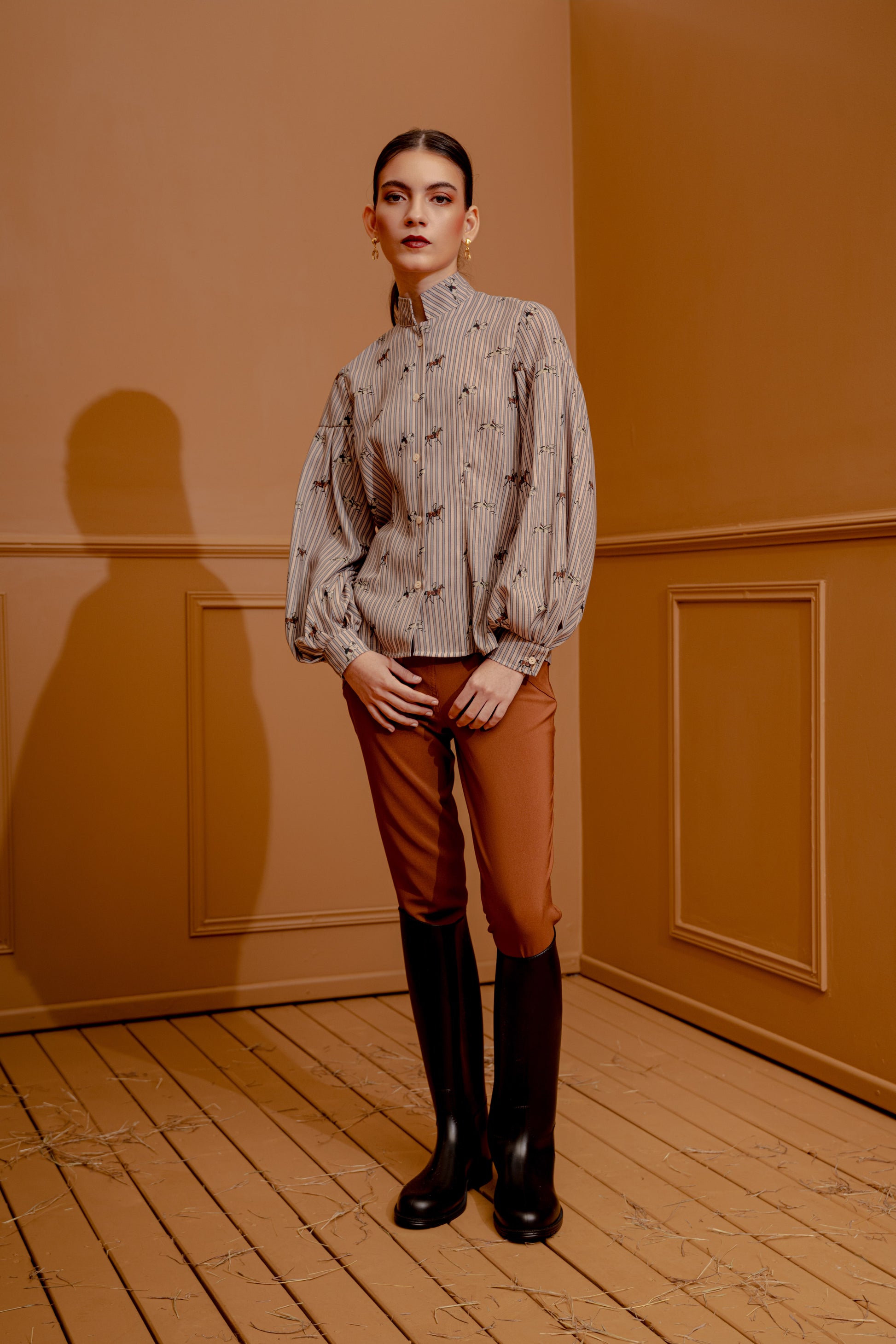 Camisa de botones con cuello Nerú y mangas largas de silueta bombacha que terminan en puños cortos. Su textil combina un estampado de rayas y caballos que aporta carácter y contraste a una prenda clásica con detalles distintivos.