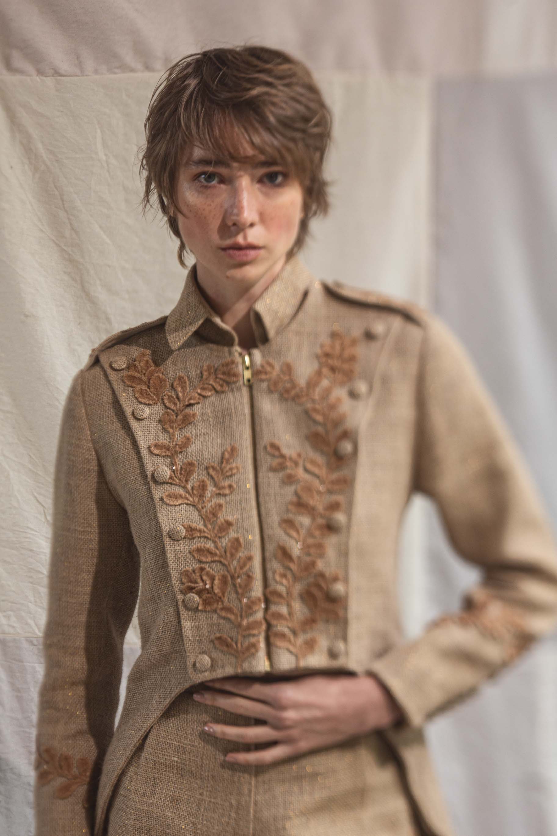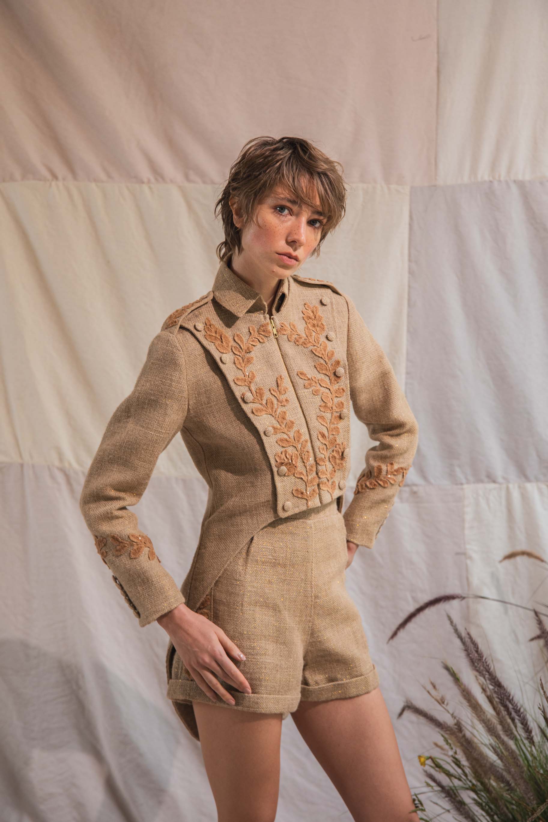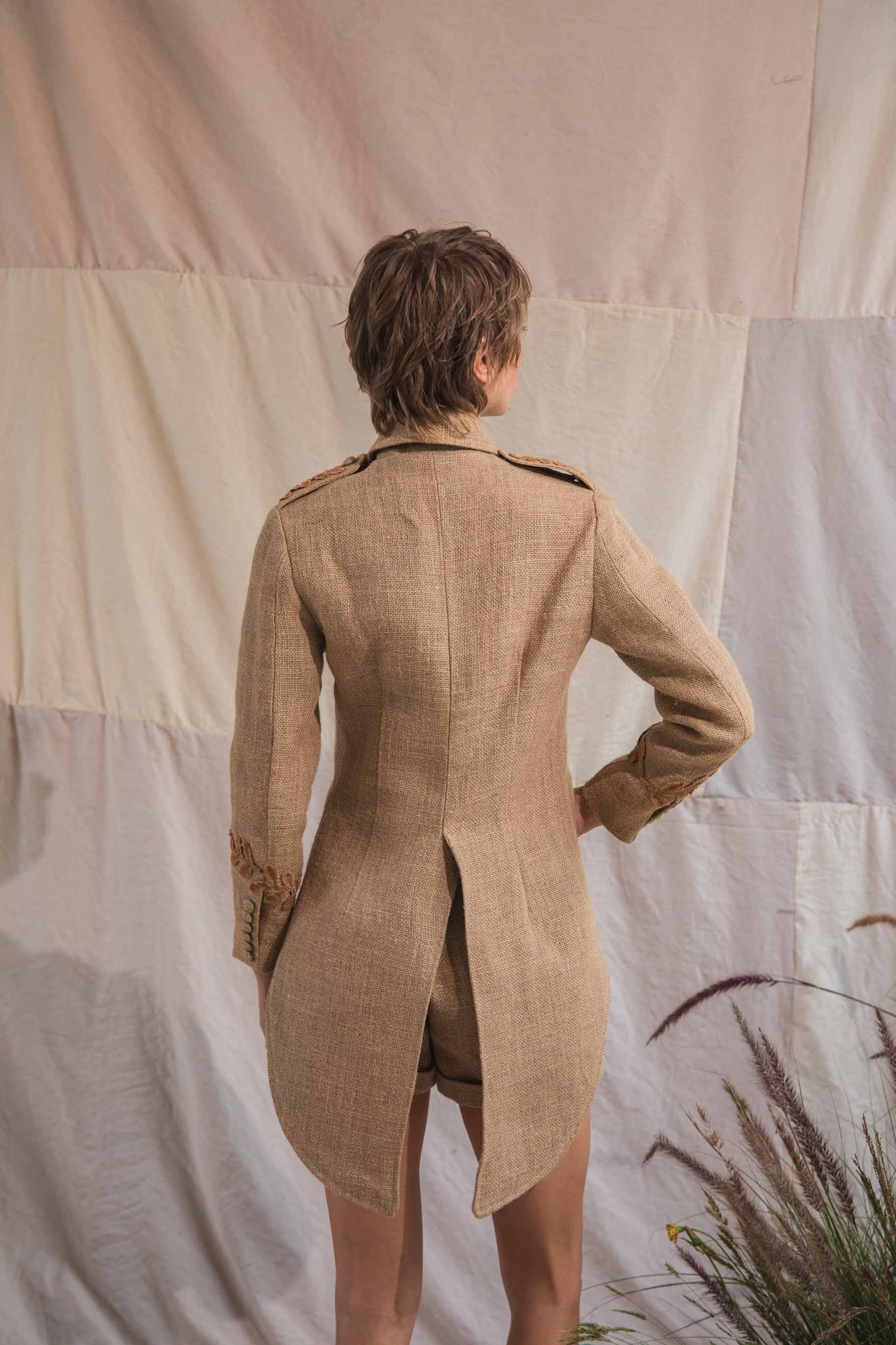 Chaqueta corta con cola de pato, inspirada en una chaqueta militar ligera, con charreteras en los hombros, apliques en color café en el frente y botones decorativos forrados.