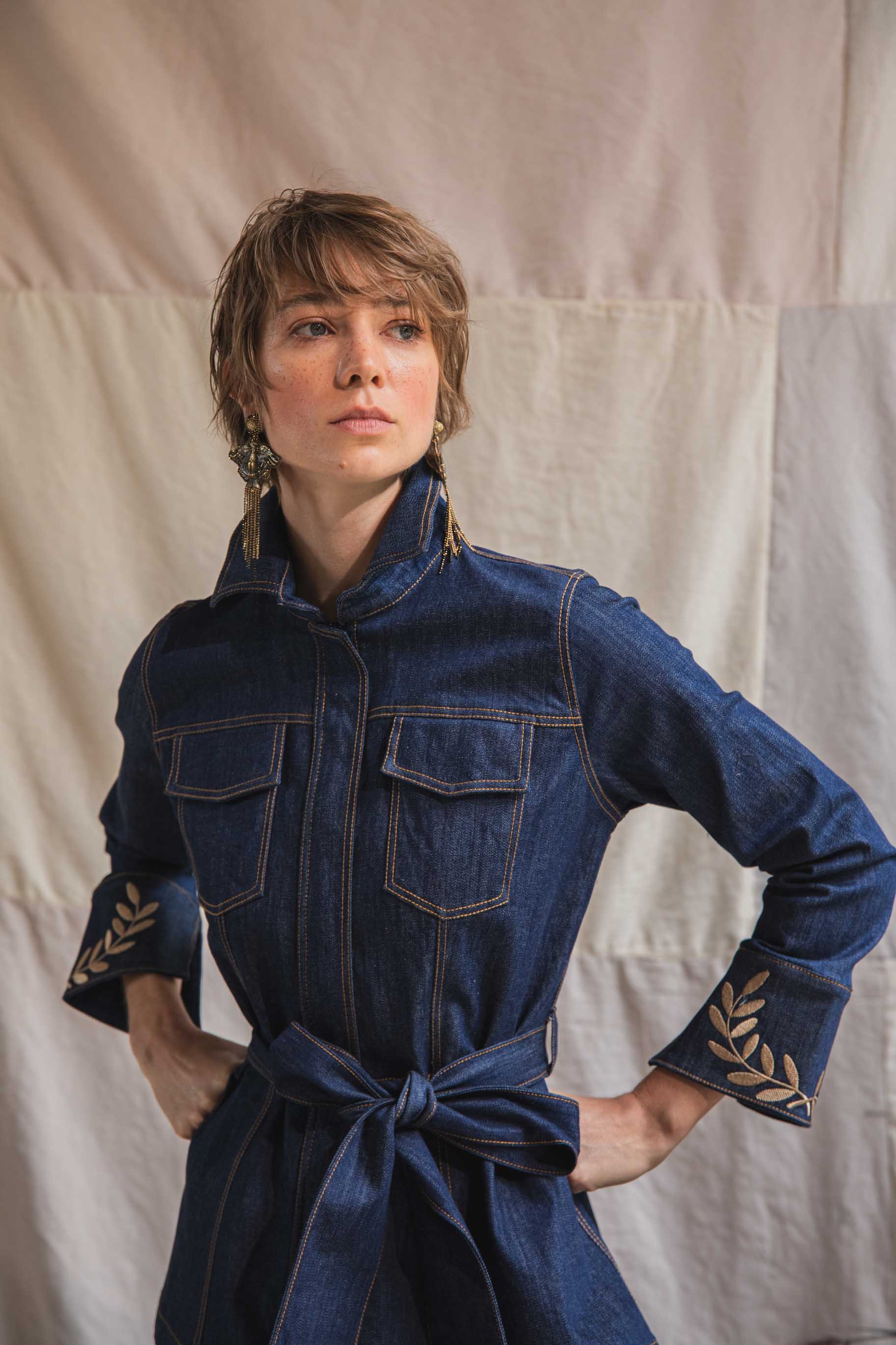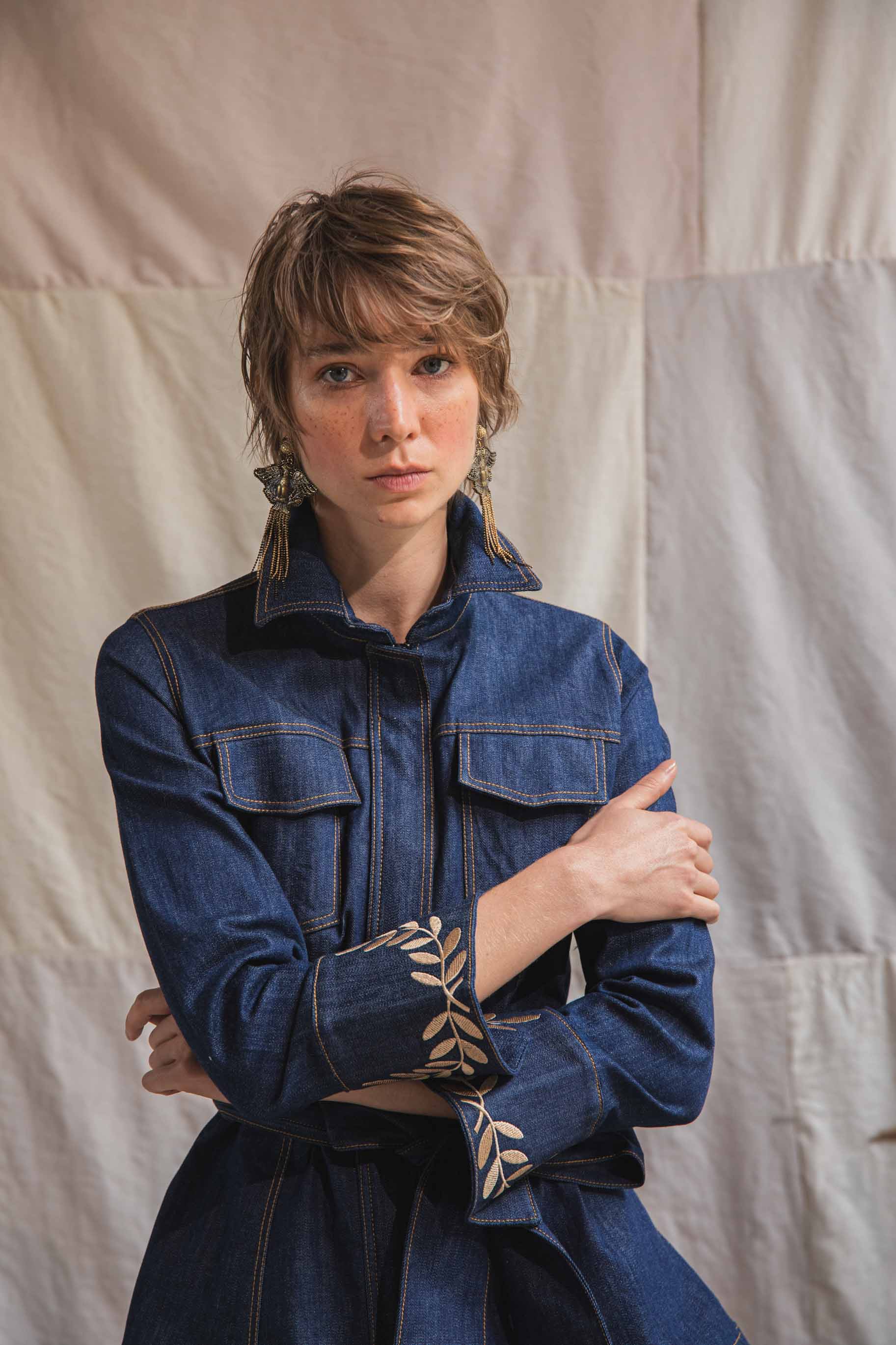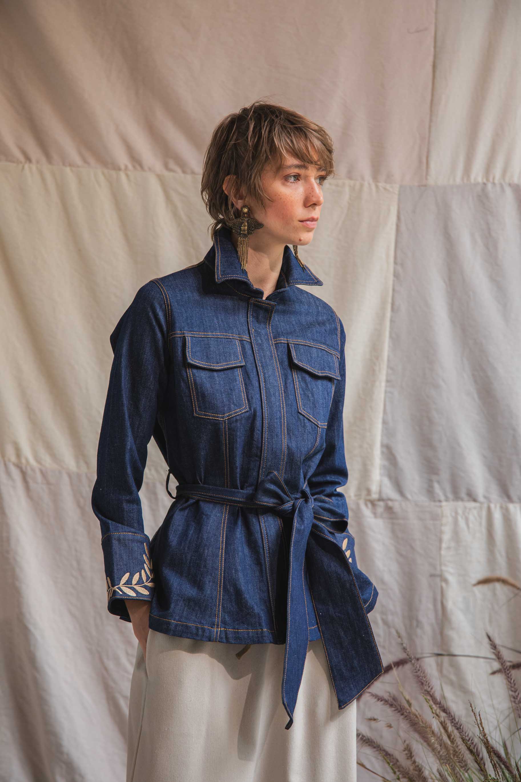 Chaqueta de botones con pasadores a la altura de la cintura, bolsillos tipo parche a la altura del corazón, cinturón no fijo para amarrarlo de distintas maneras y puños bordados.