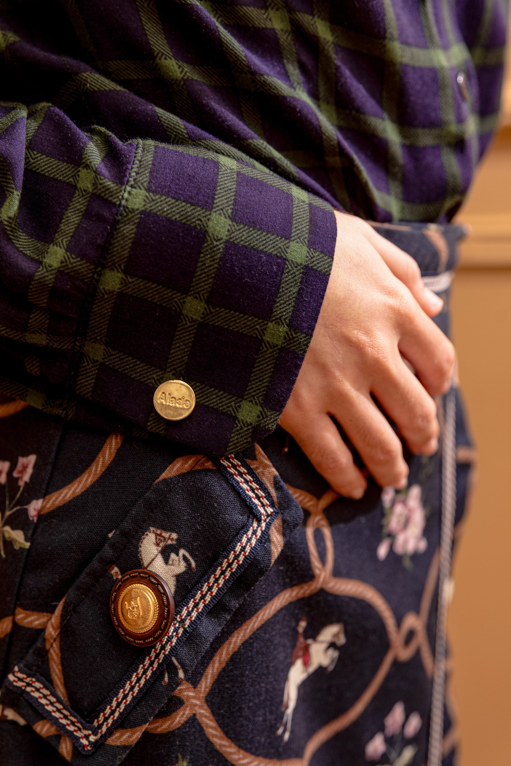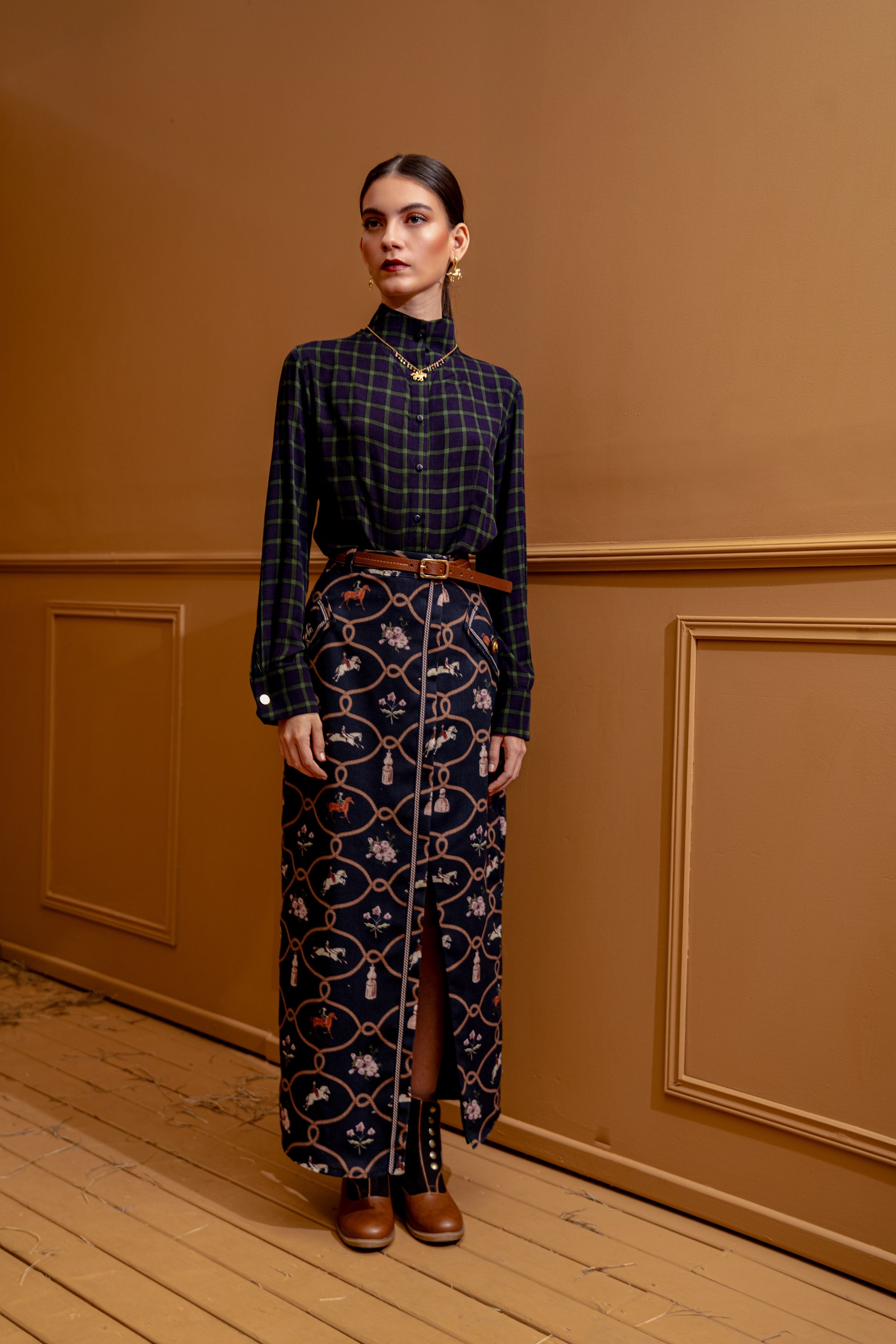 Camisa de botones con cuello Nerú y mancornas de Alado en joyería. Confeccionada en chaliz ligero y respirable con patrón de cuadros escoceses en tonos azules y verdes.