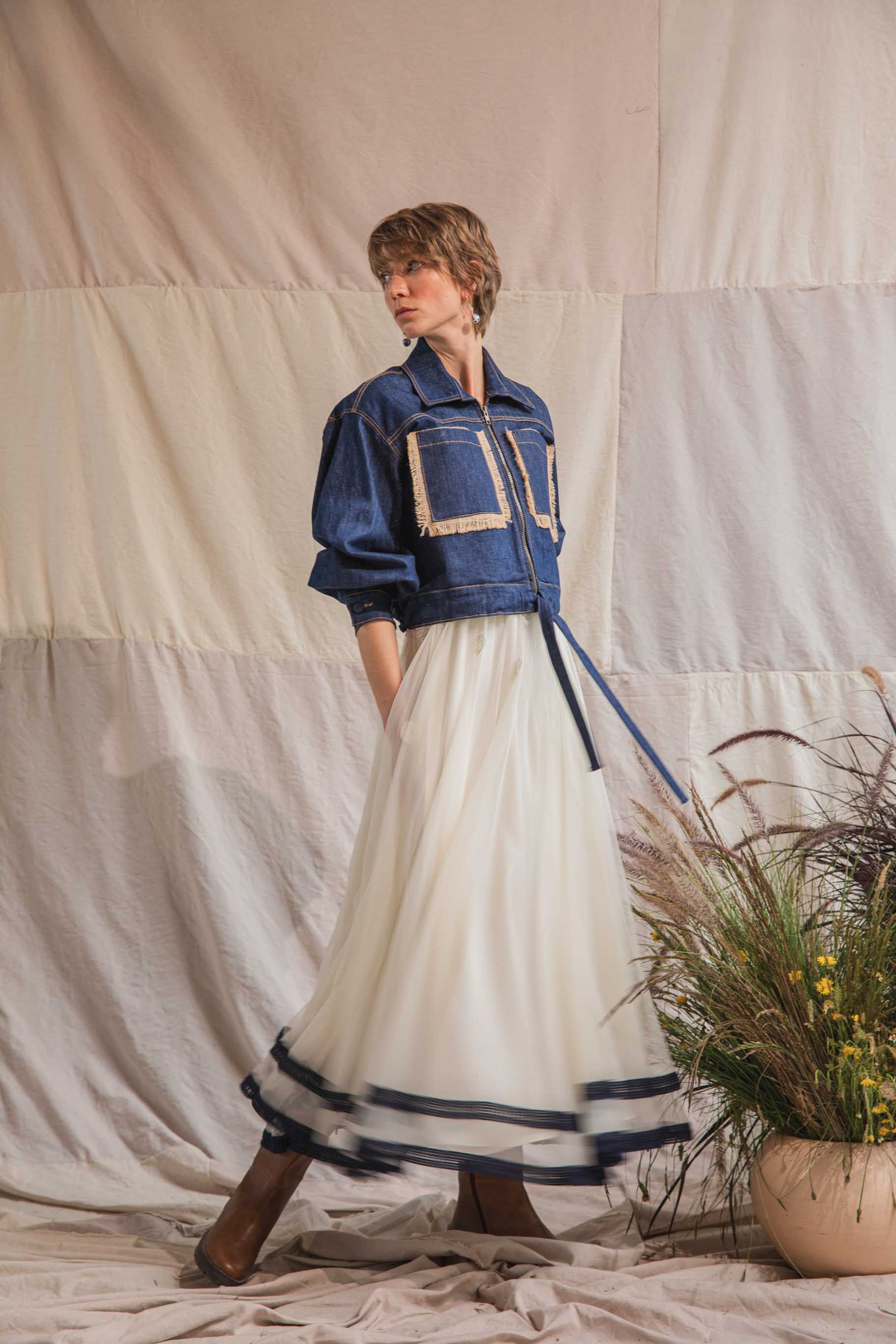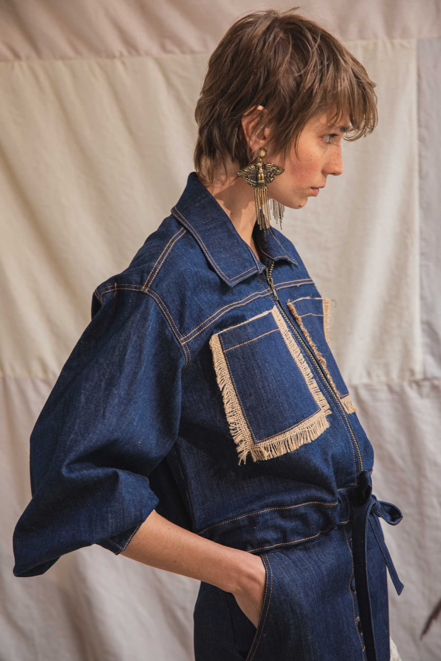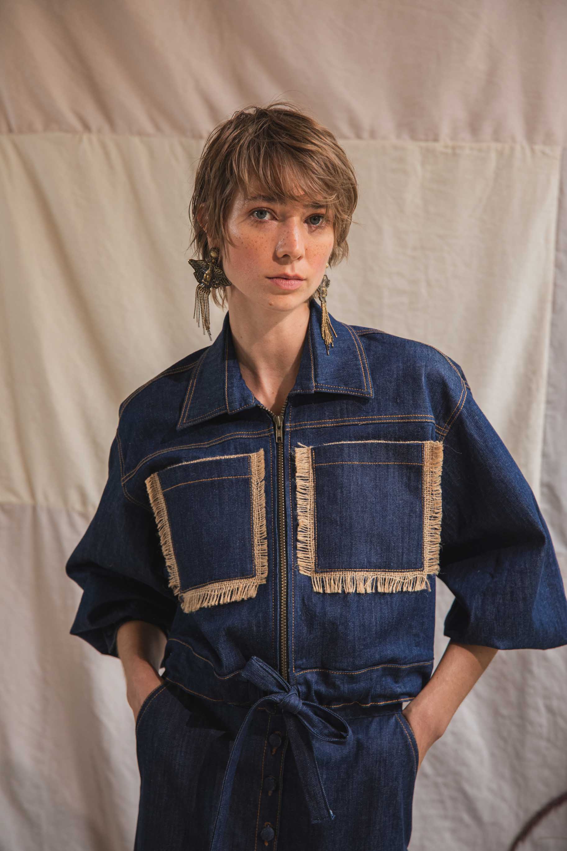 Chaqueta de denim corta con manga amplia 3/4 y elástico en los puños, cierre al frente, túnel con tira para ajustar en la cintura, y bolsillos tipo parche a ambos lados del pecho con detalles en fique.