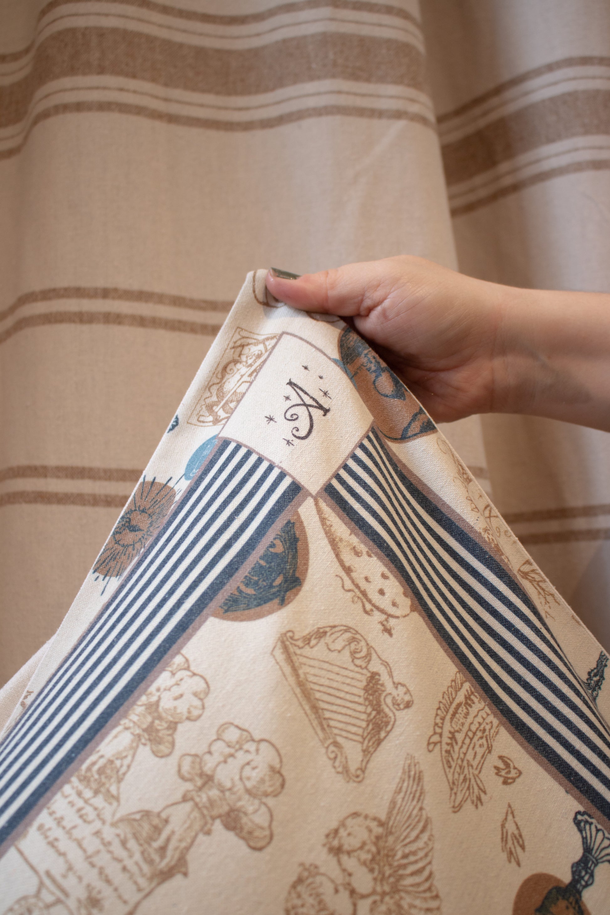 Este cojín cuadrado grande tiene un diseño único con ilustraciones de exvotos en tonos beige sobre un fondo ocre. Está hecho con una tela suave y resistente de algodón recuperado y PET reciclado