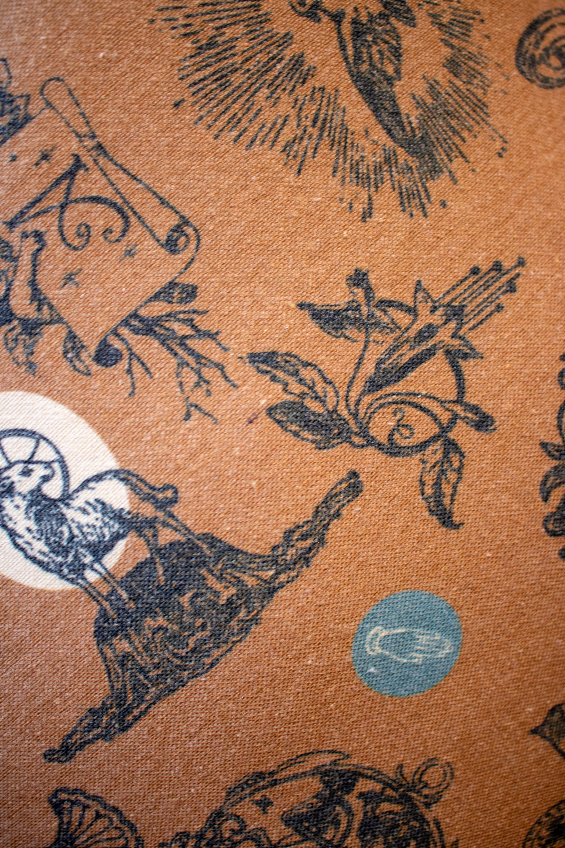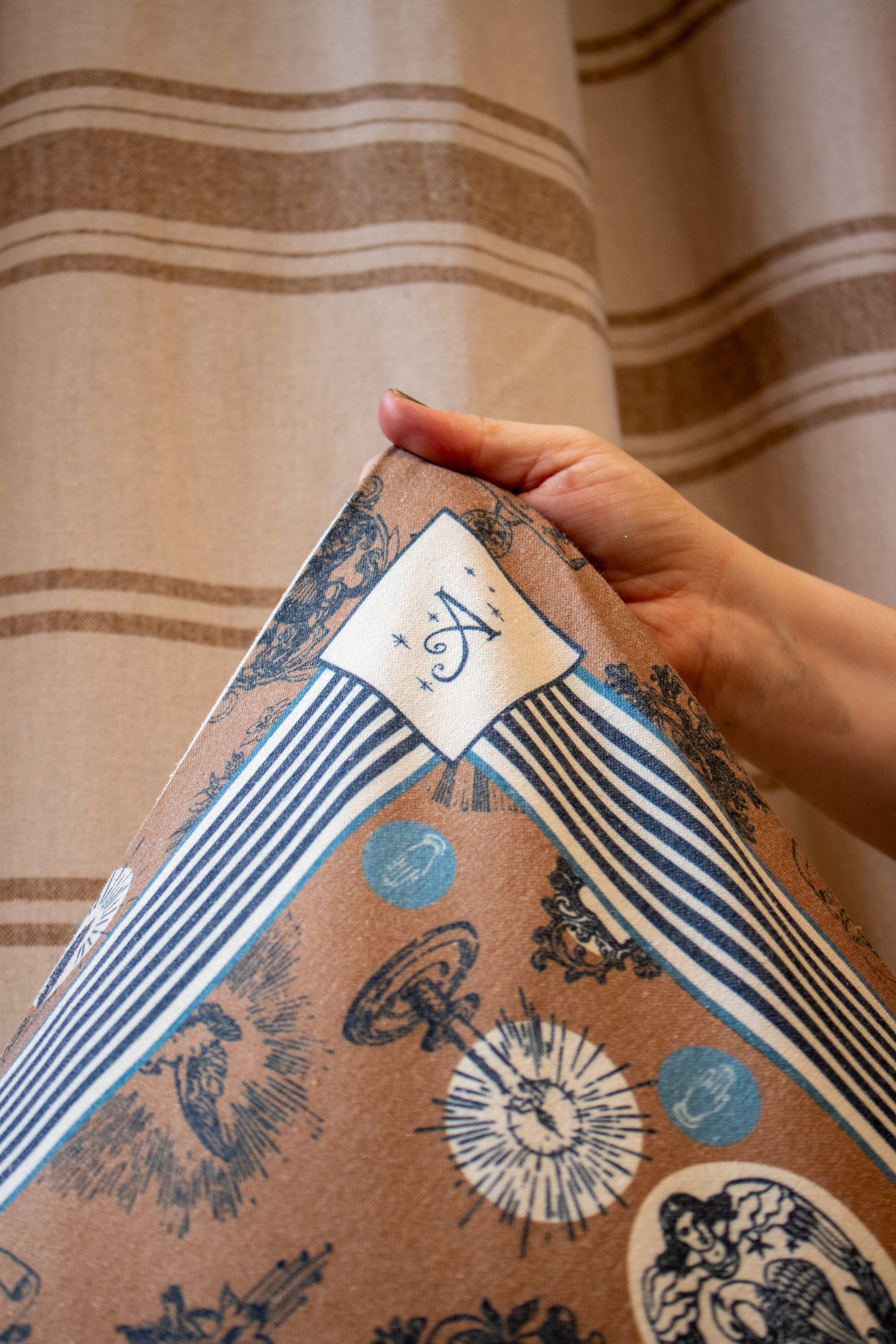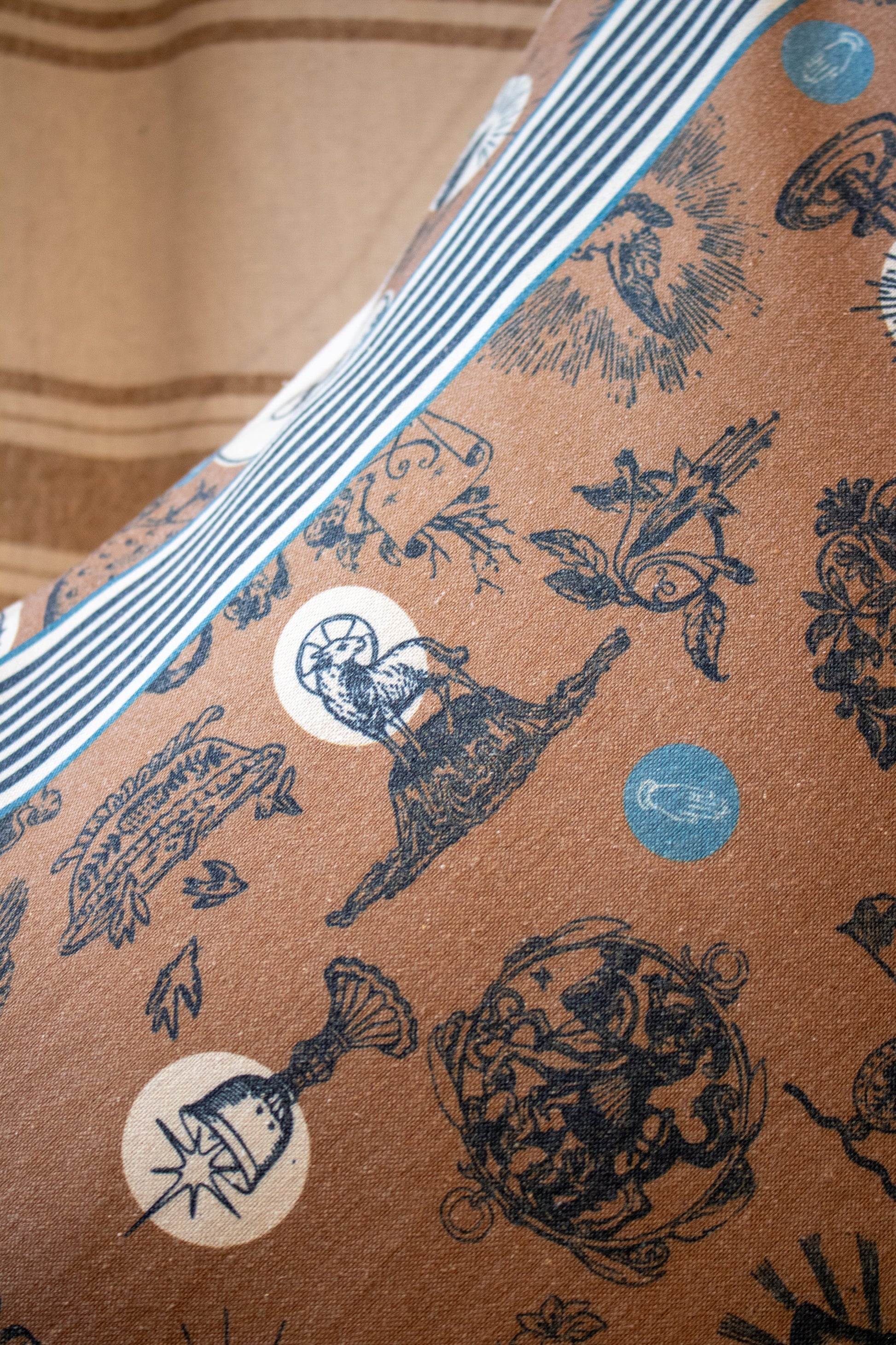 Este cojín cuadrado grande tiene un diseño único con ilustraciones de exvotos en tonos beige sobre un fondo ocre. Está hecho con una tela suave y resistente de algodón recuperado y PET reciclado