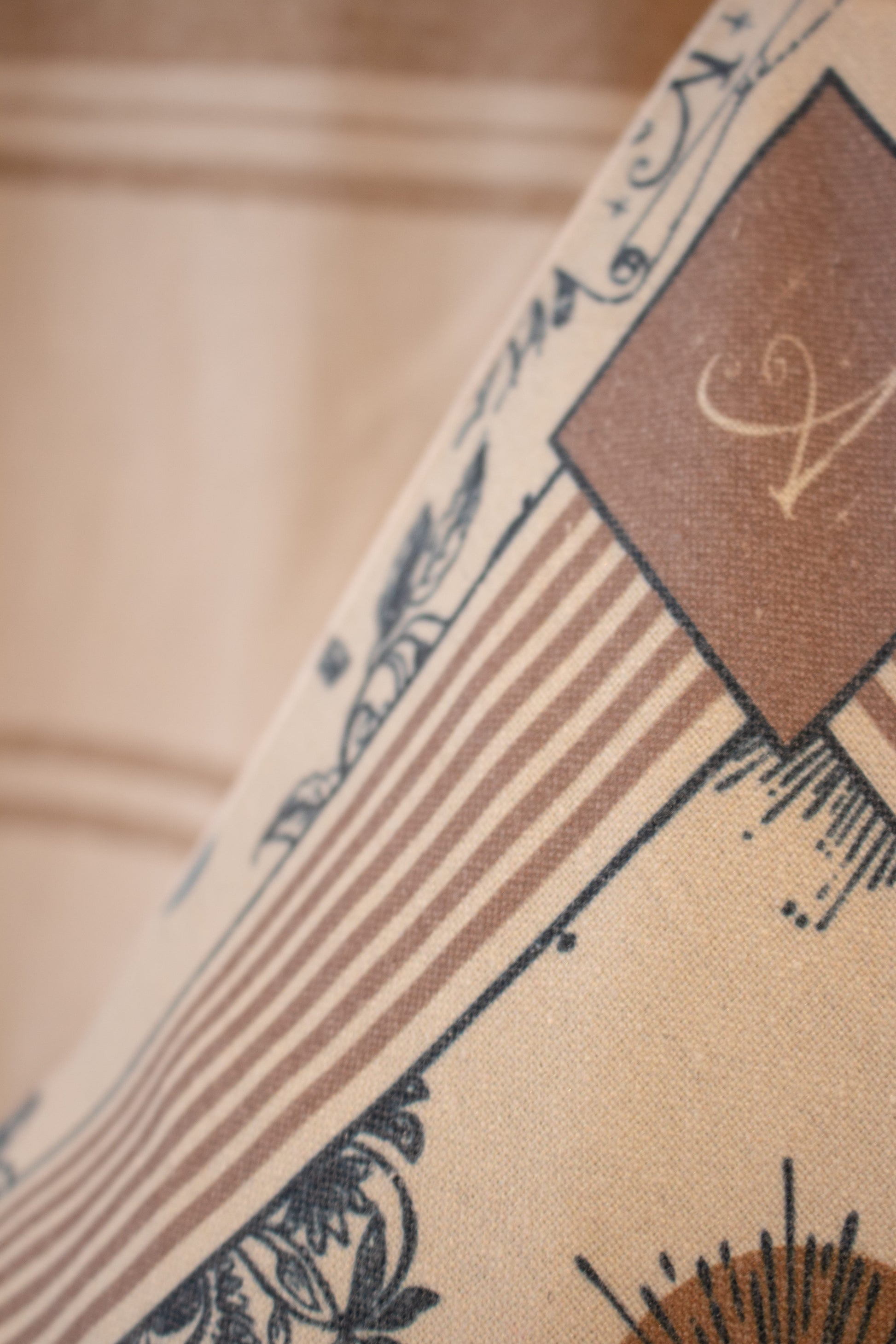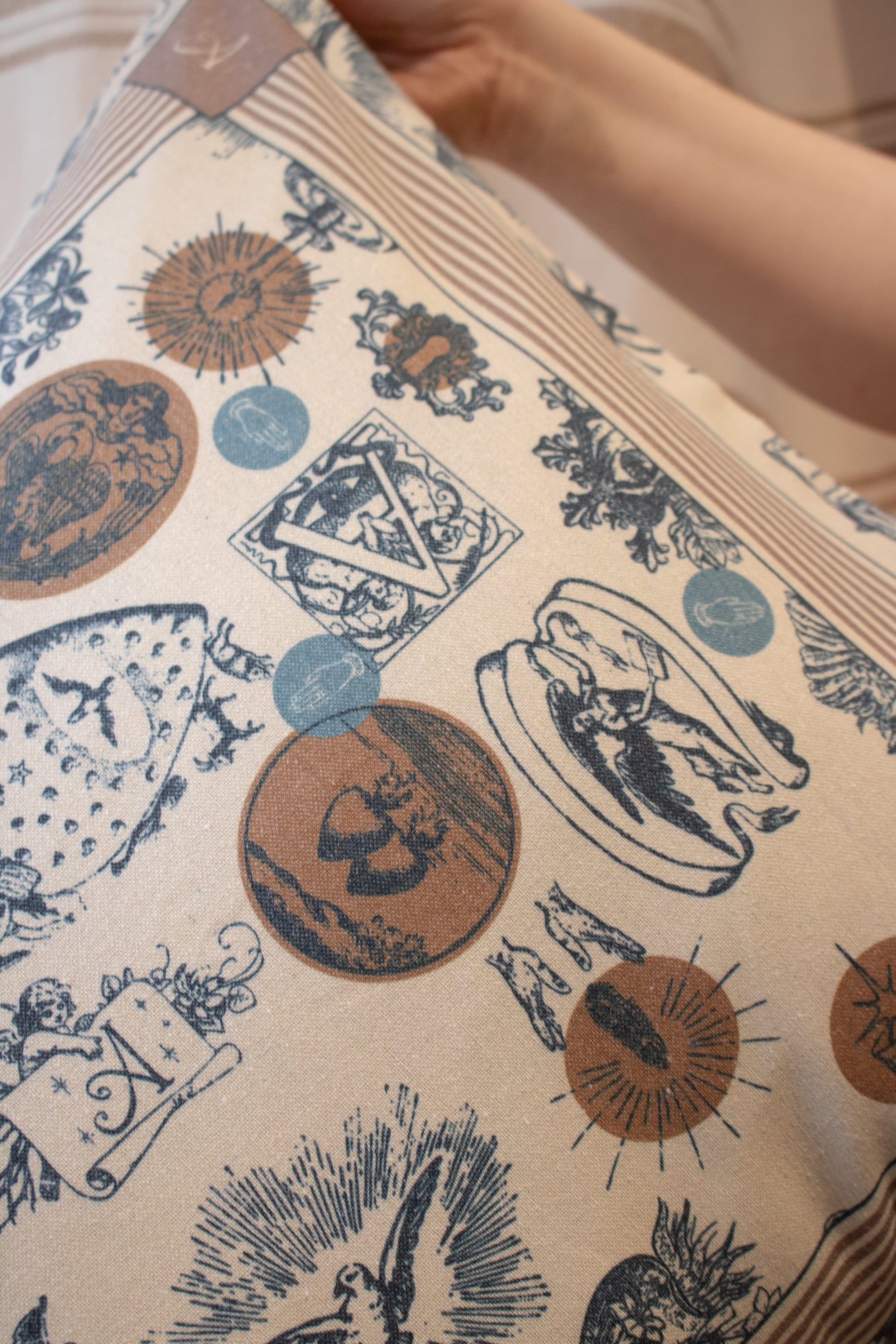 Este cojín cuadrado grande tiene un diseño único con ilustraciones de exvotos en tonos beige sobre un fondo ocre. Está hecho con una tela suave y resistente de algodón recuperado y PET reciclado