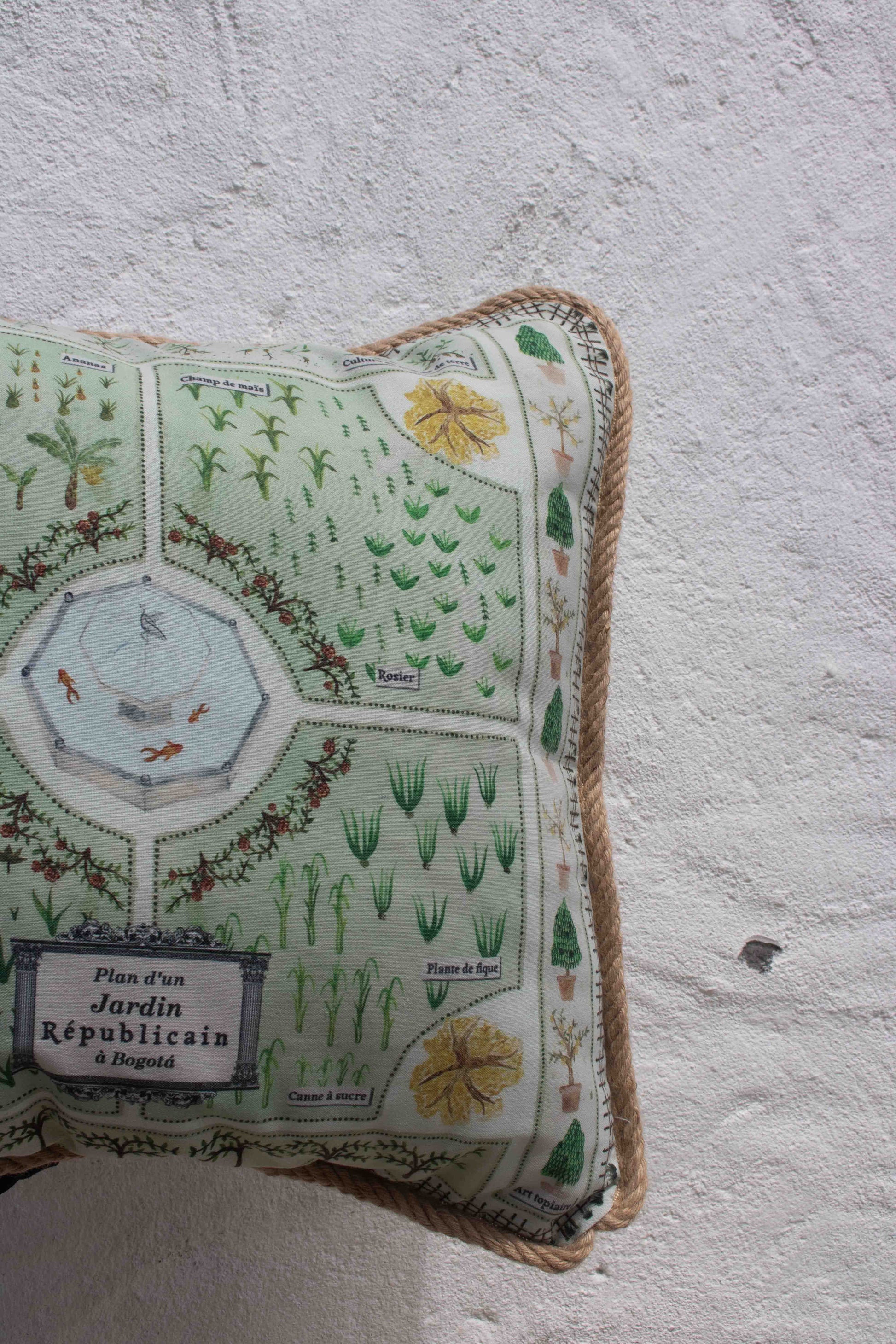 Este cojín cuadrado de 60x60 cm es una pieza única que celebra el diseño artesanal colombiano. Su patrón Jardín Republicano, pintado a mano sobre tela de algodón recuperado y PET reciclado, aporta carácter, historia y conciencia ambiental a cualquier espacio.