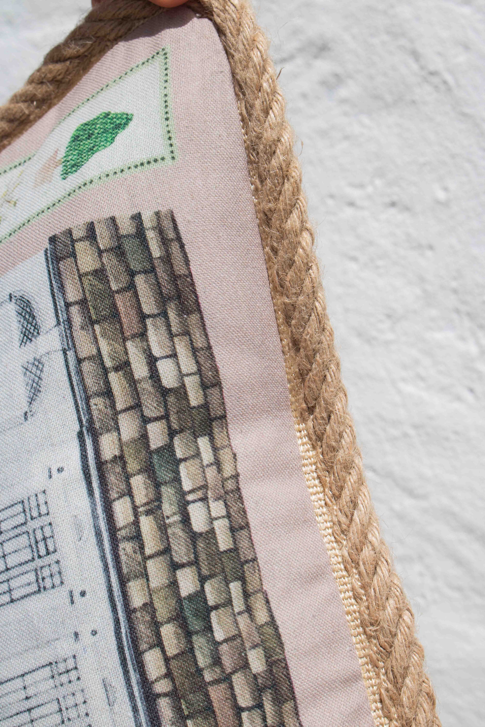 Confeccionado en tela de algodón recuperado y PET reciclado, tiene reverso con cierre tipo sobre en monte y un borde en cordón de fique natural, que resalta su esencia artesanal.