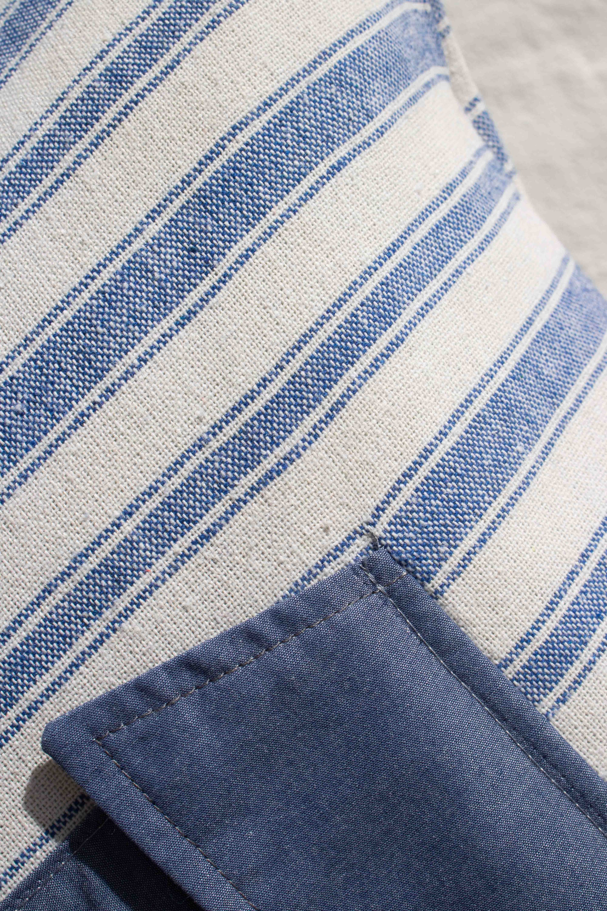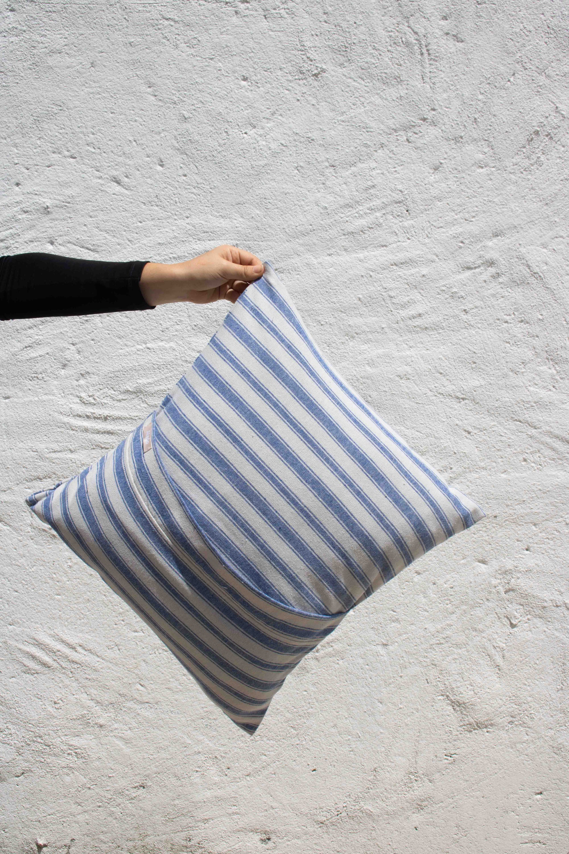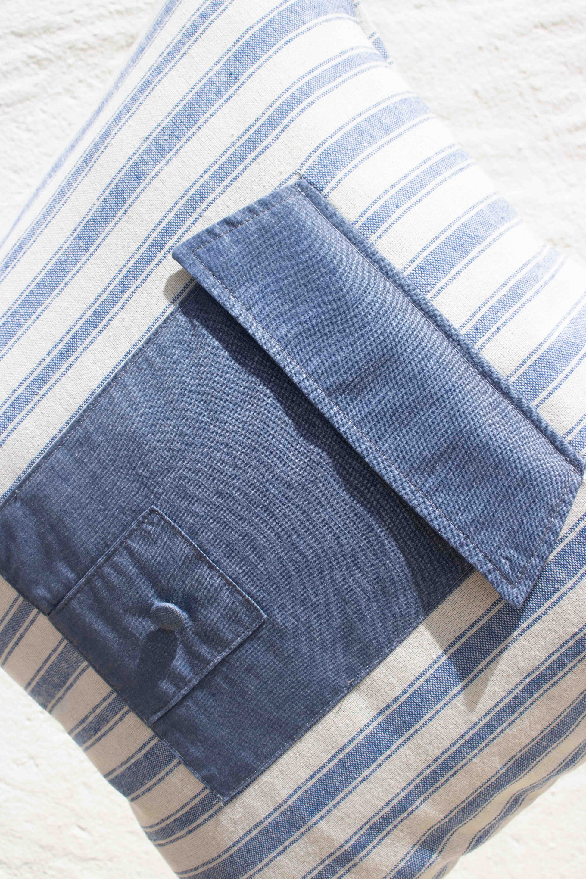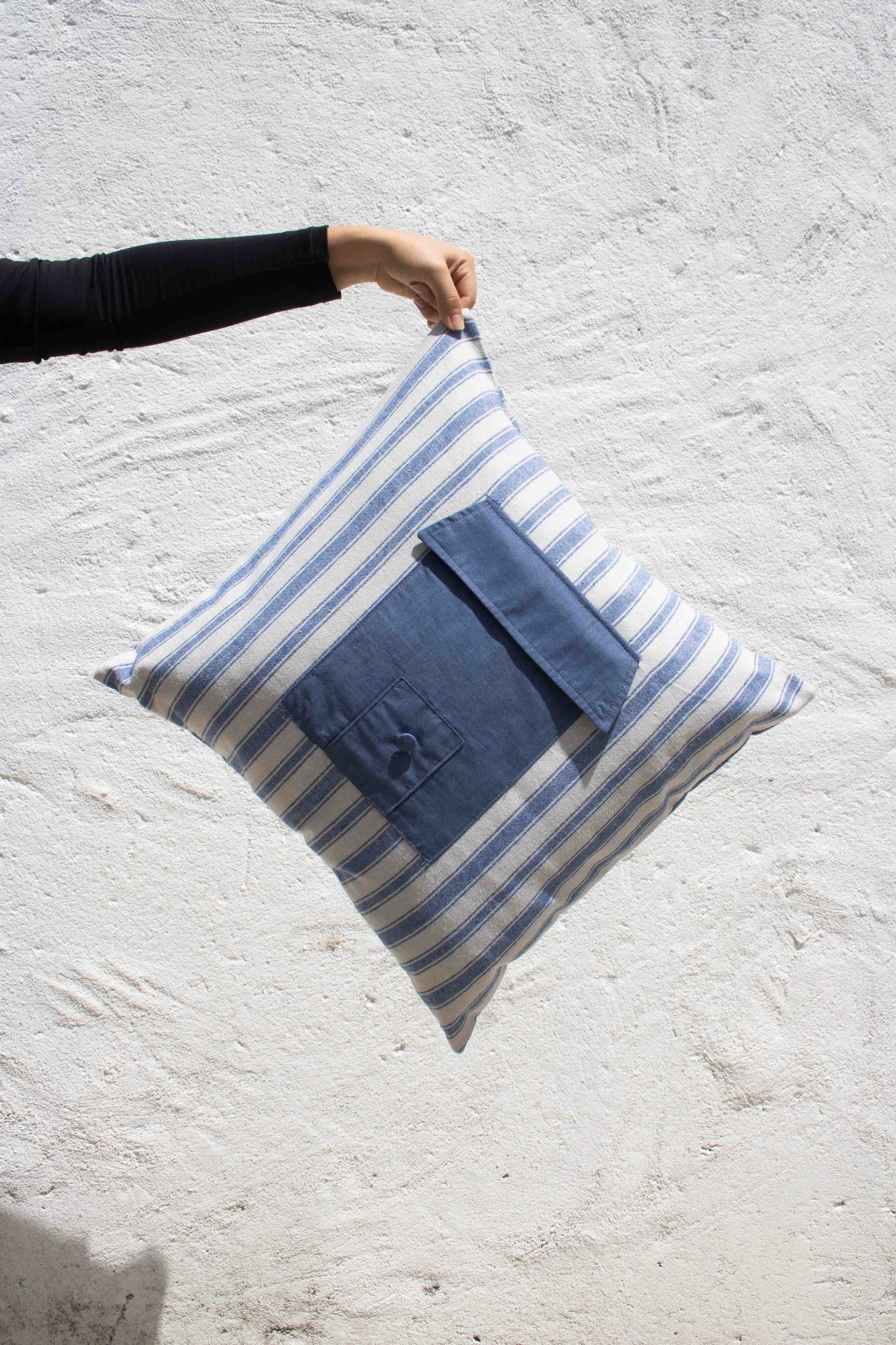 Cojín cuadrado confeccionado en nuestra tela signature de rayas azules tipo colchón, un textil de carácter atemporal que aporta textura y elegancia sutil. En el frente, incorpora un bolsillo en forma de casa que destaca por su diseño estructurado y su funcionalidad estética.