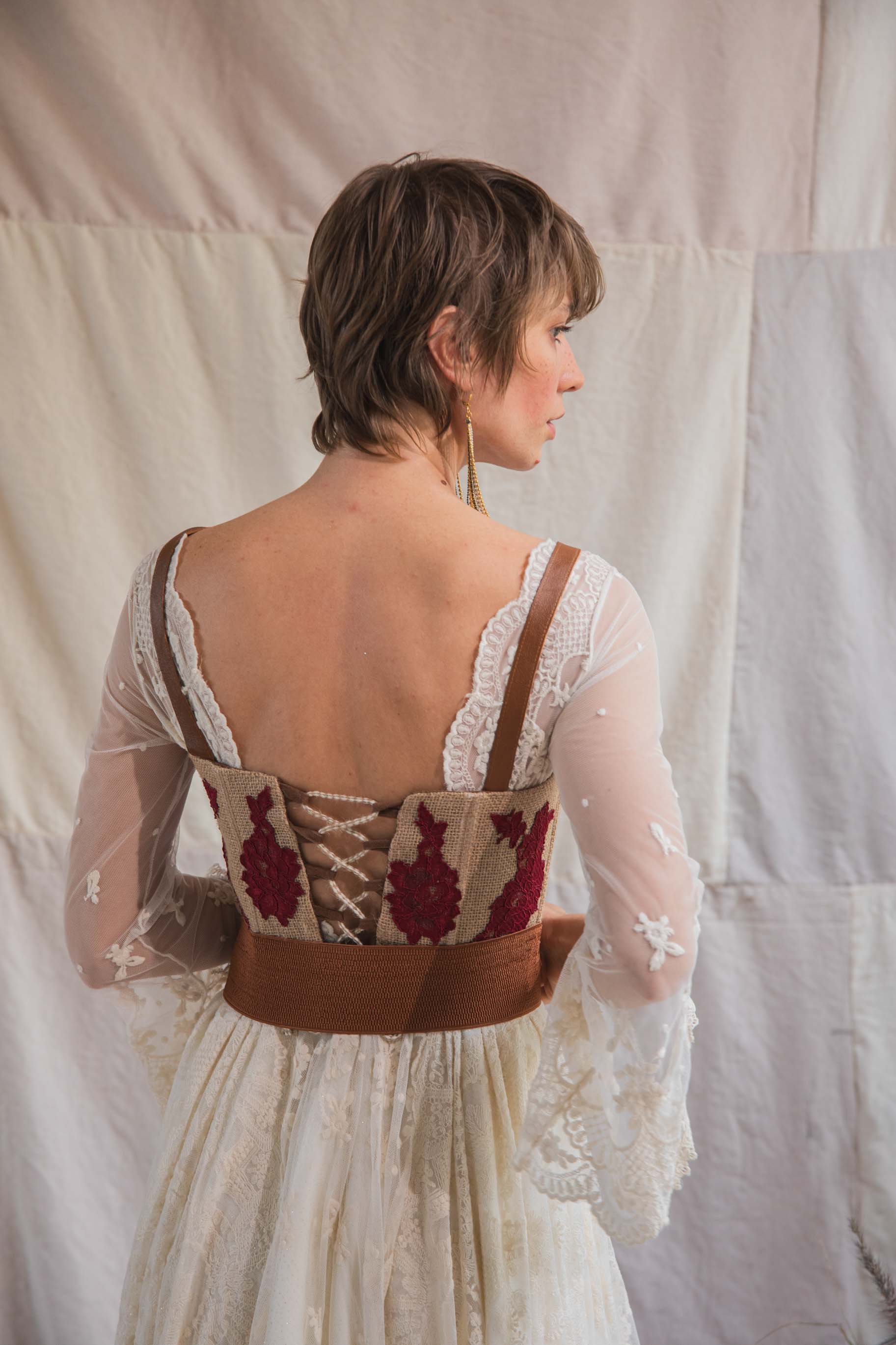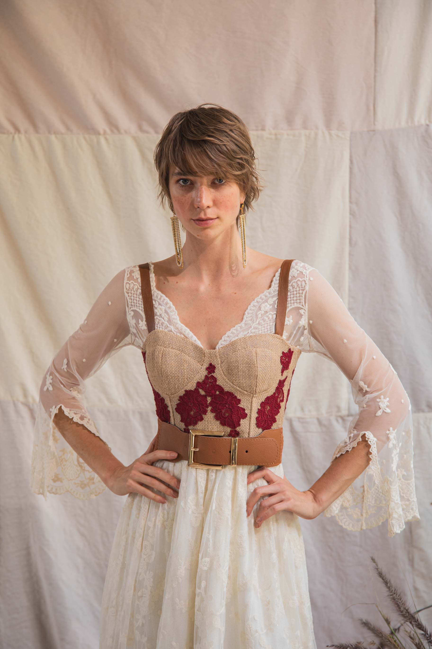 Corsé estructurado confeccionado en tela de fique, completamente forrado. Incorpora varillas internas para dar soporte y definición a la silueta. Cuenta con cargaderas en cuero y apliques decorativos en color rojo en la parte frontal. Sistema de ajuste tipo corsé en la espalda mediante cordones. Terminaciones internas limpias y costuras reforzadas.