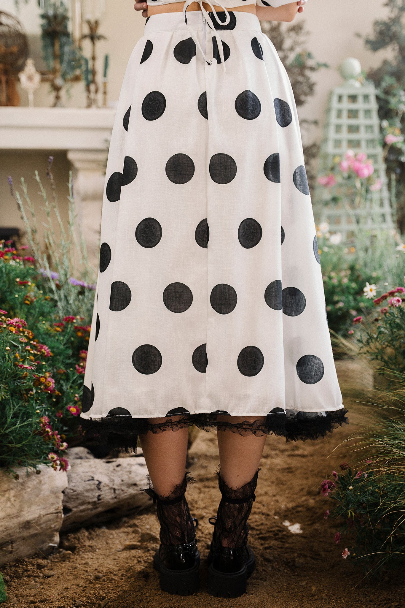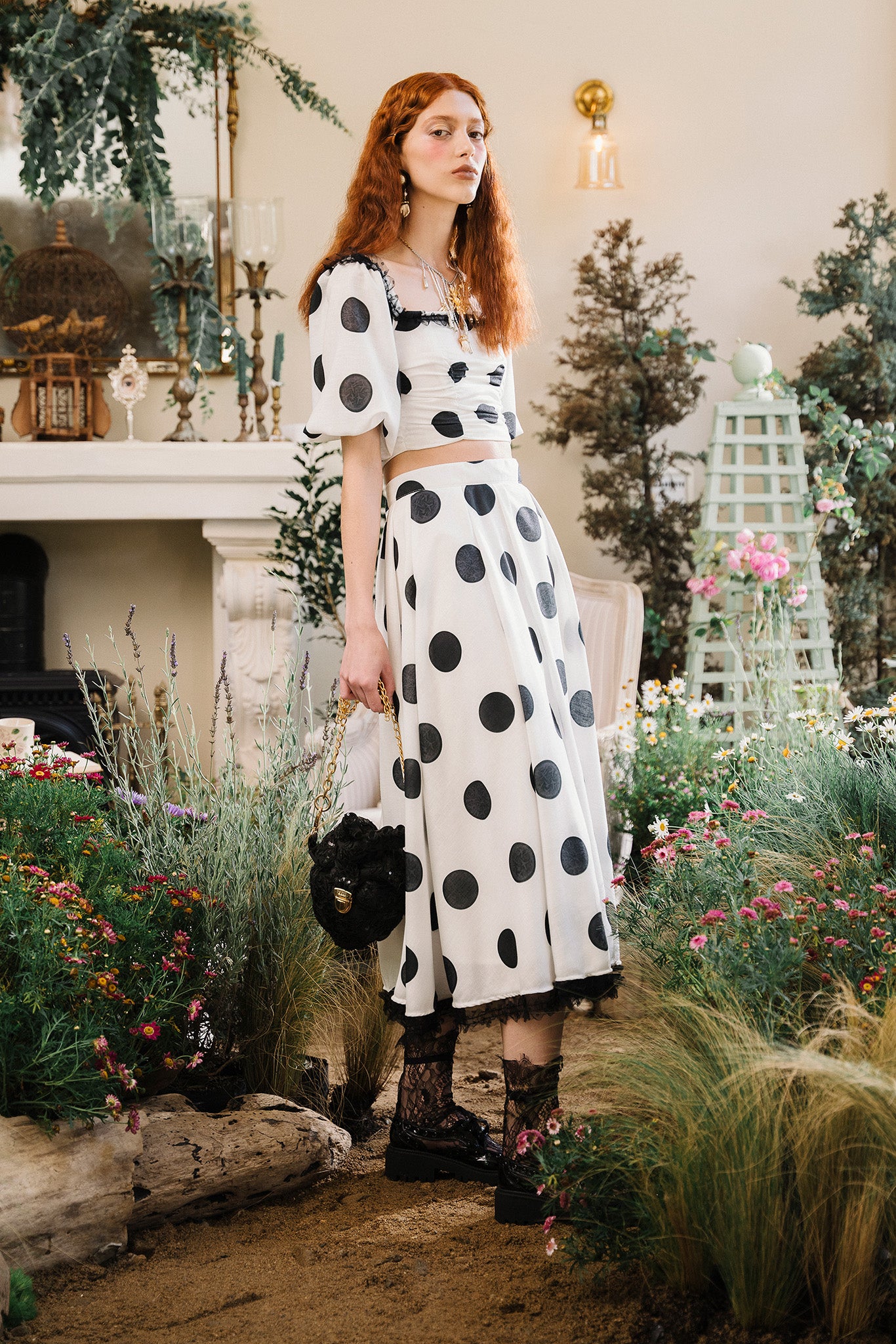 Falda de silueta amplia y tiro alto, confeccionada en textil de polka dots inspirados en la imagen microscópica de una lágrima. Presenta pretina estructurada y caída fluida, con cierre en la parte posterior.