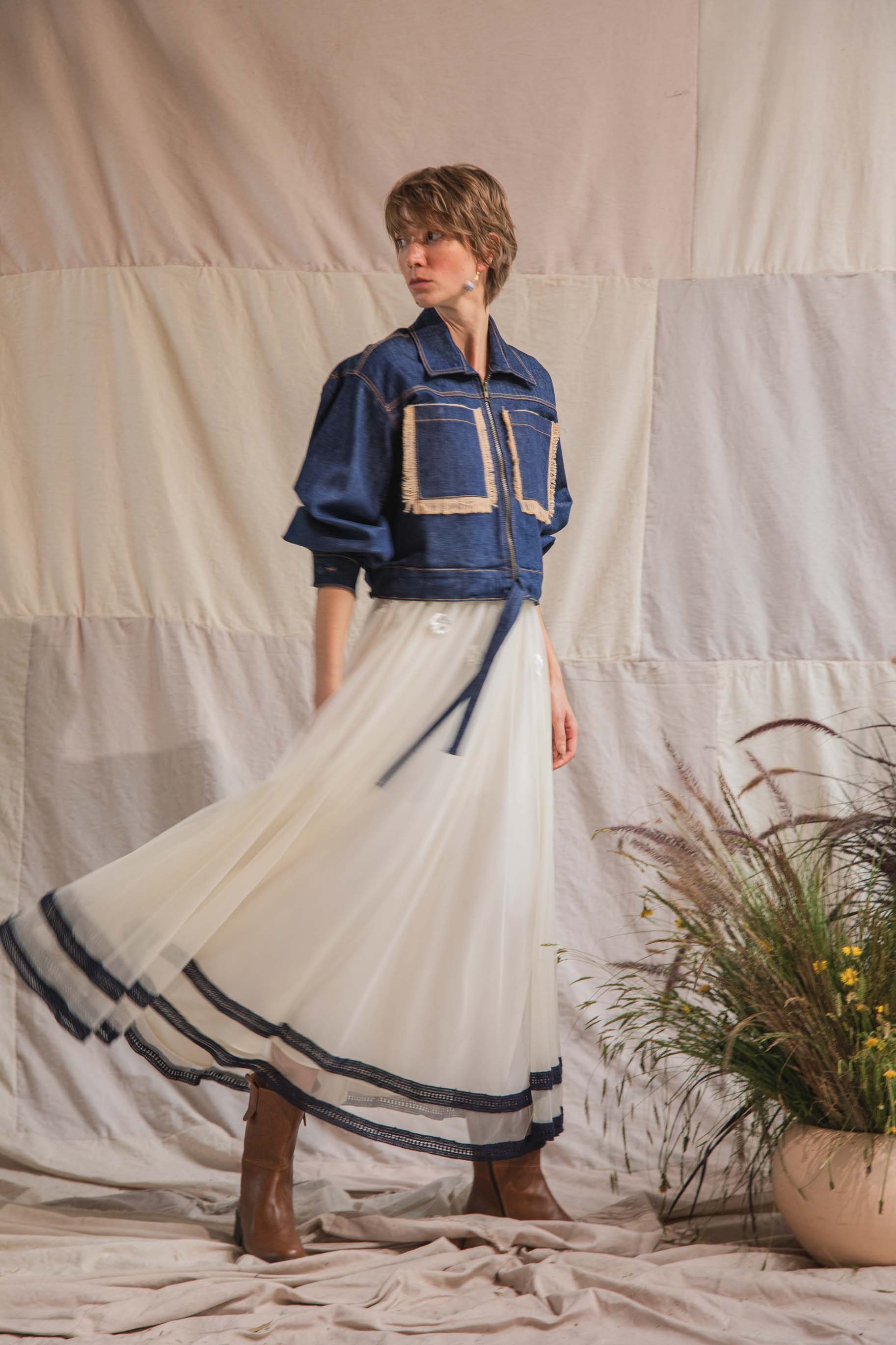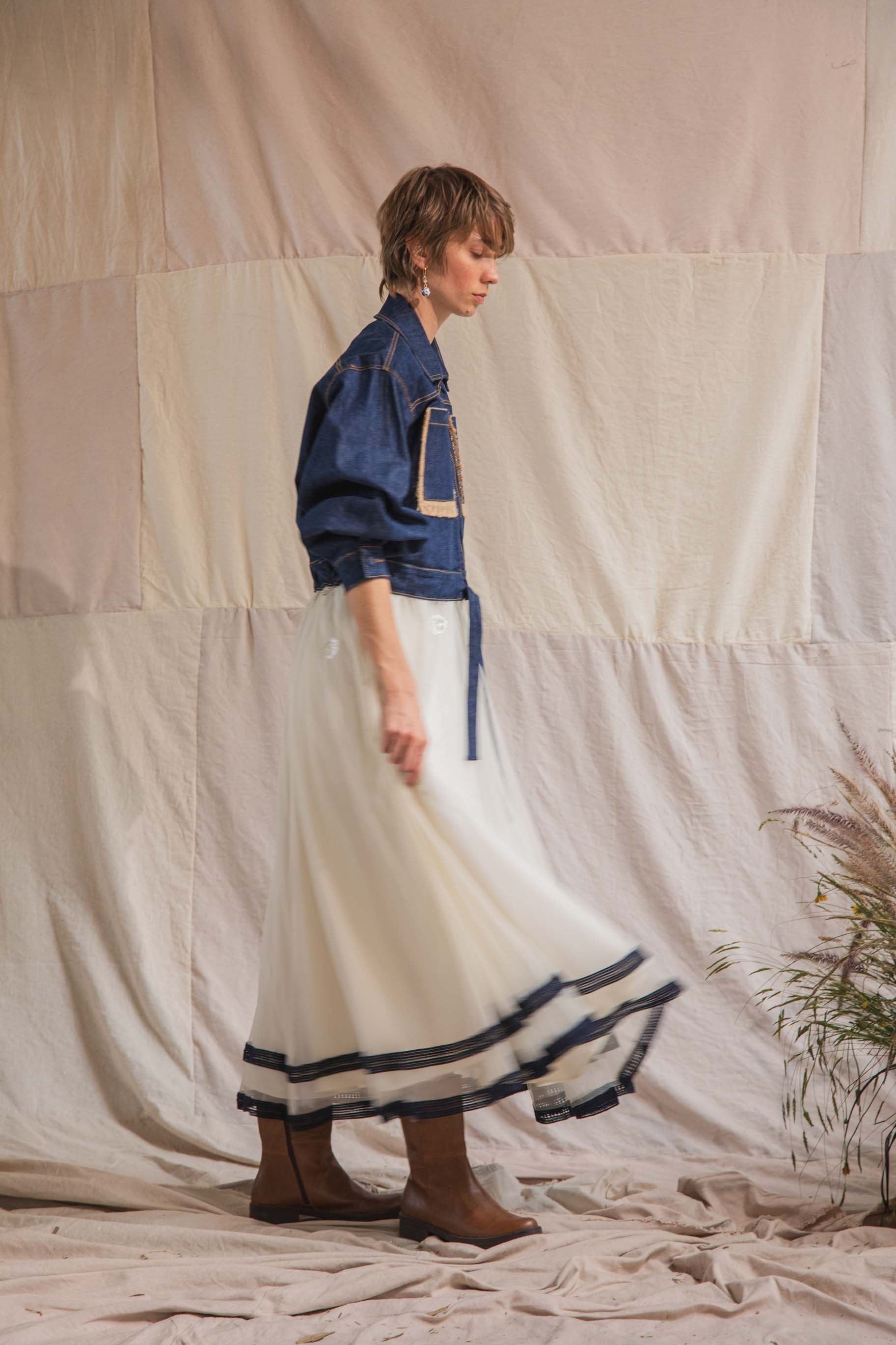 Falda en capas con base en malla tex o malla mate, y una segunda capa superior también en malla mate. Terminada con hiladilla azul decorativa en el ruedo