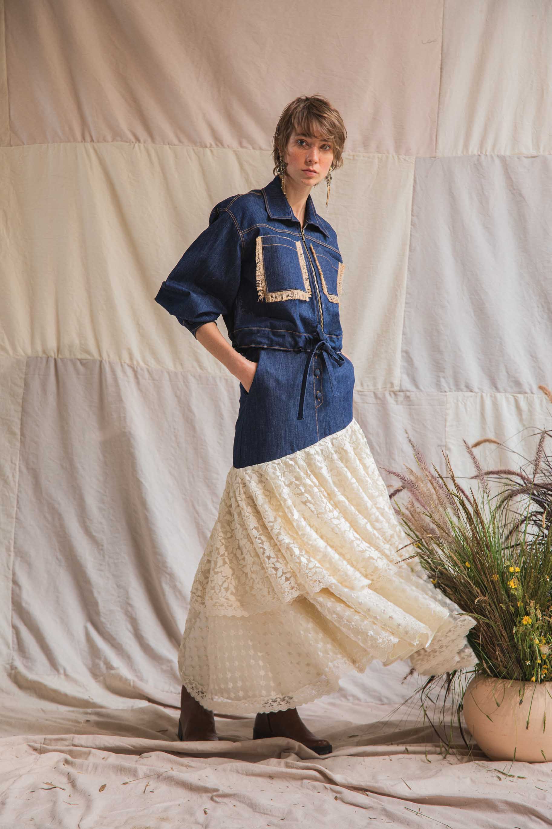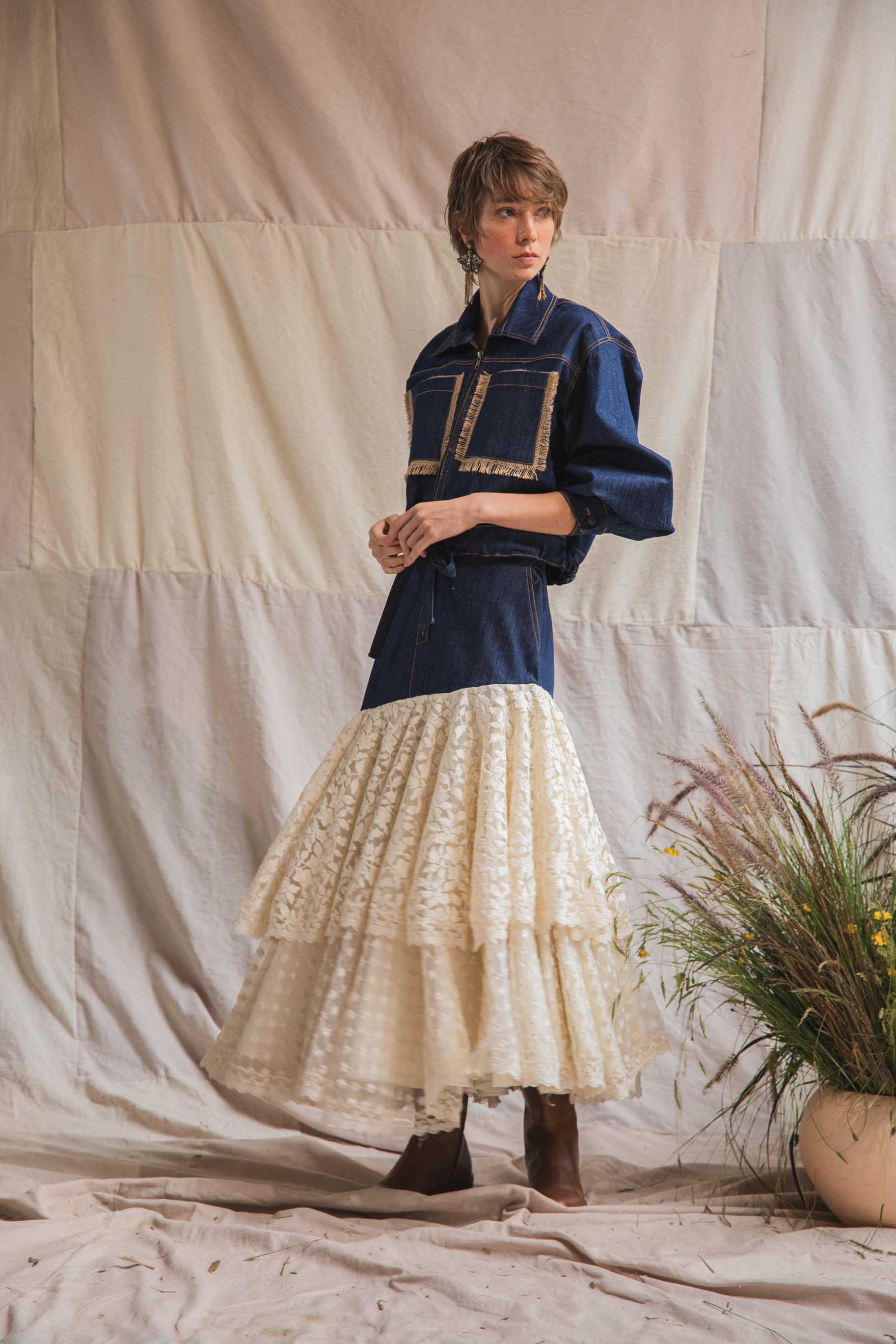 Falda asimétrica de 2 partes, con falda superior de denim con pretina, pasadores, bragueta y botón, combinada con una falda de boleros de 2 capas de encaje.
