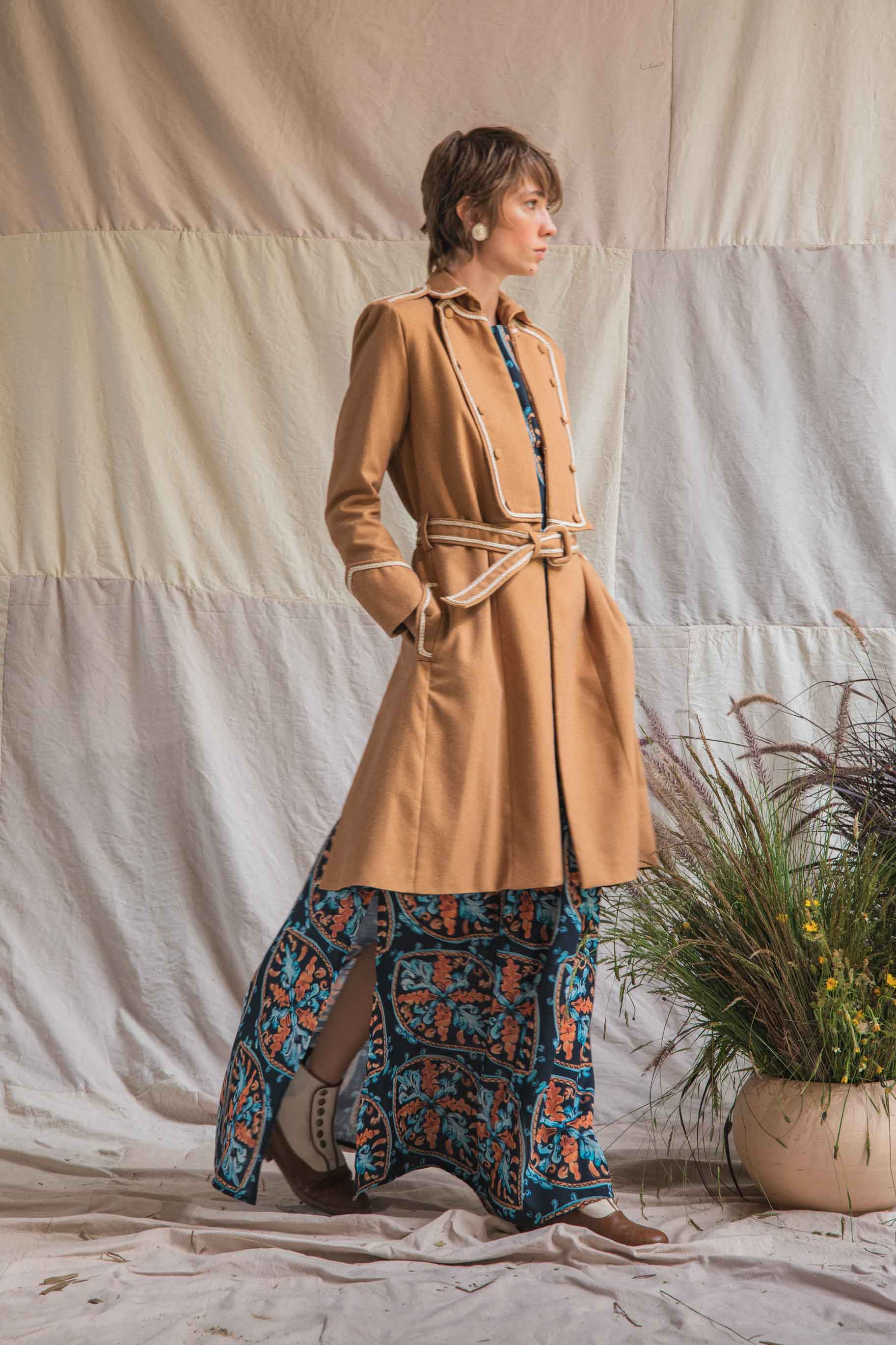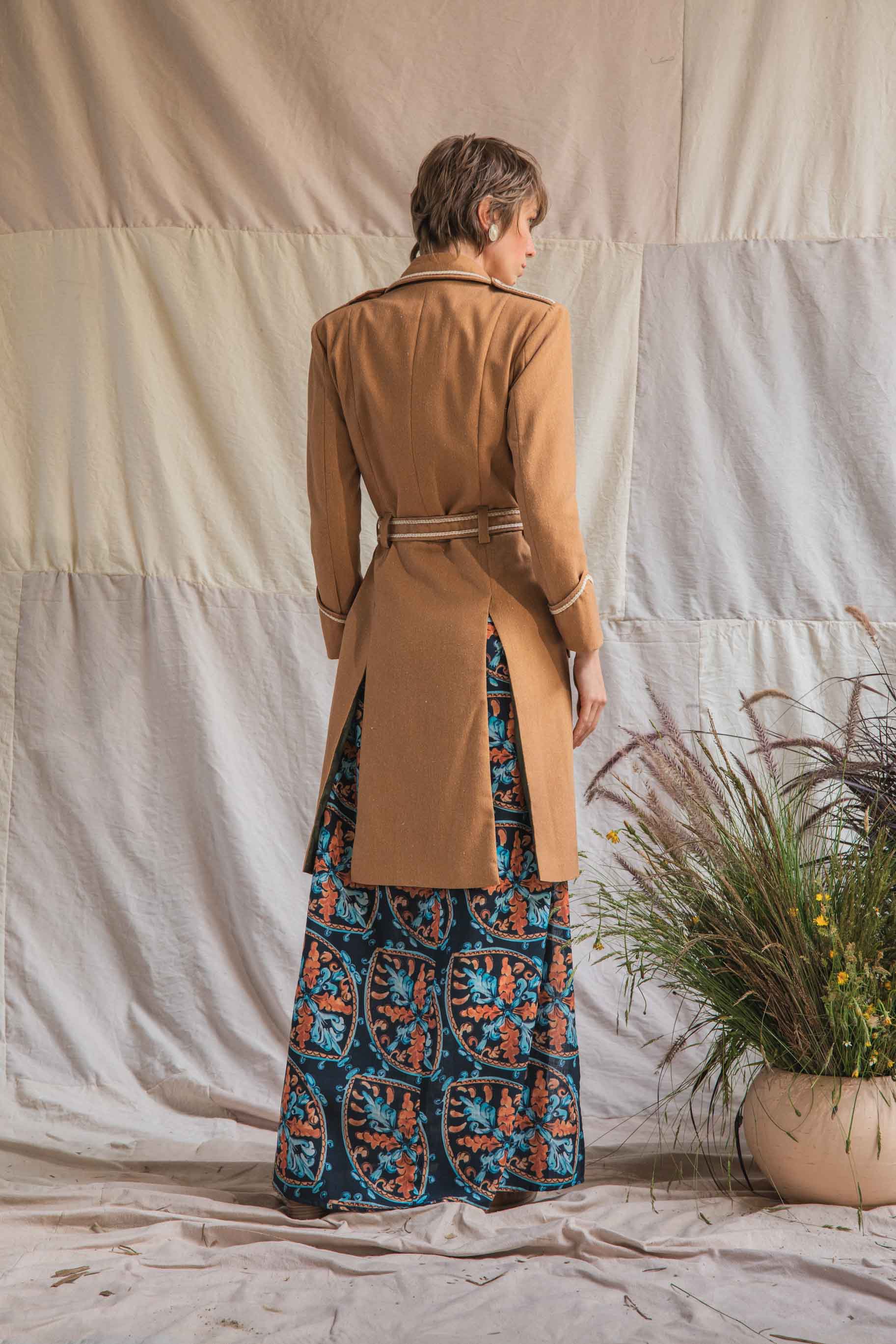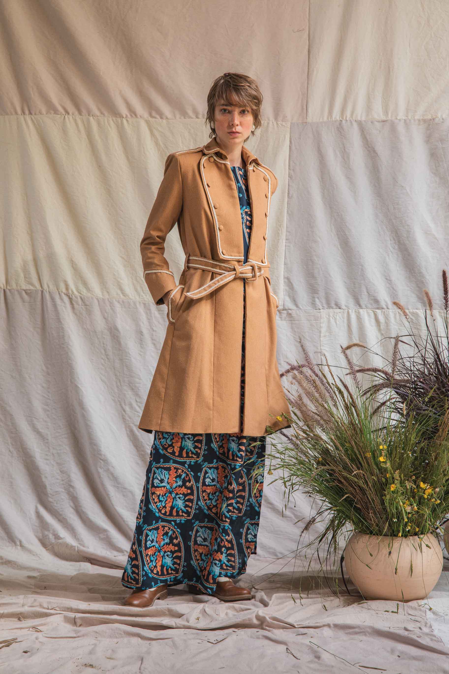 Chaqueta larga tipo hussar jacket o uniforme de gala militar ligero, con manga larga, charreteras, costuras remarcadas con sesgos, pechera y botones forrados en tela. Tiene pasadores a la altura de la cintura y un cinturón para cerrar.