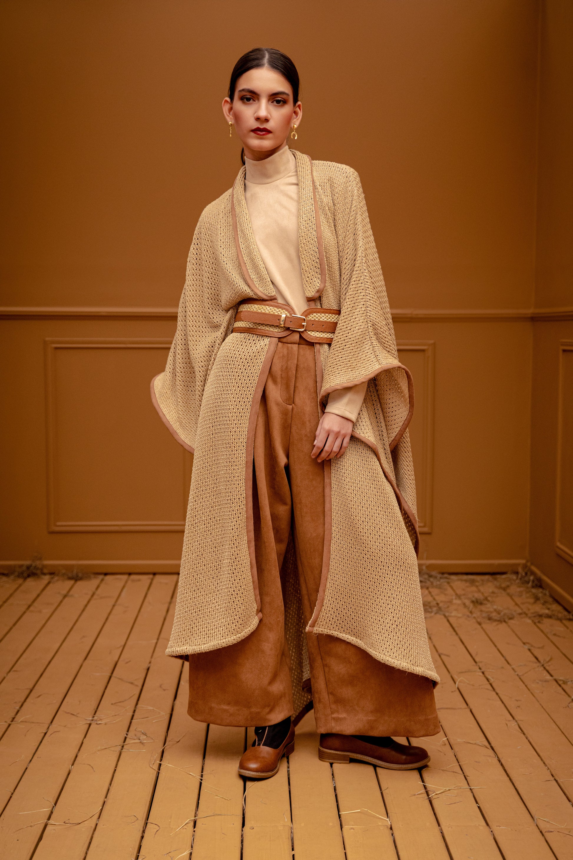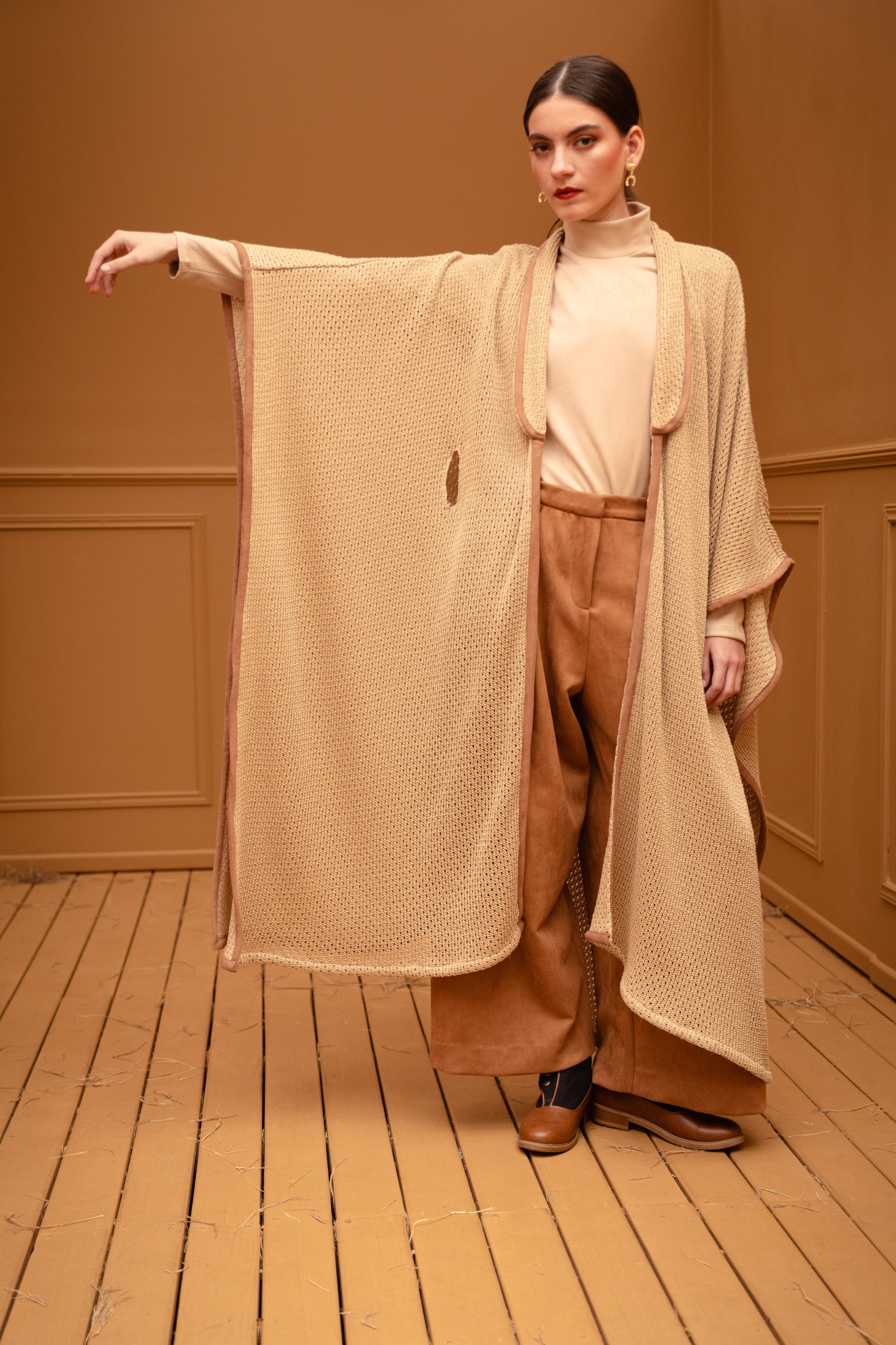 Ruana larga abierta en el frente, con solapas amplias y aberturas laterales para las manos. Confeccionada en un textil tejido de textura suave, ideal para superponer sobre distintas siluetas.