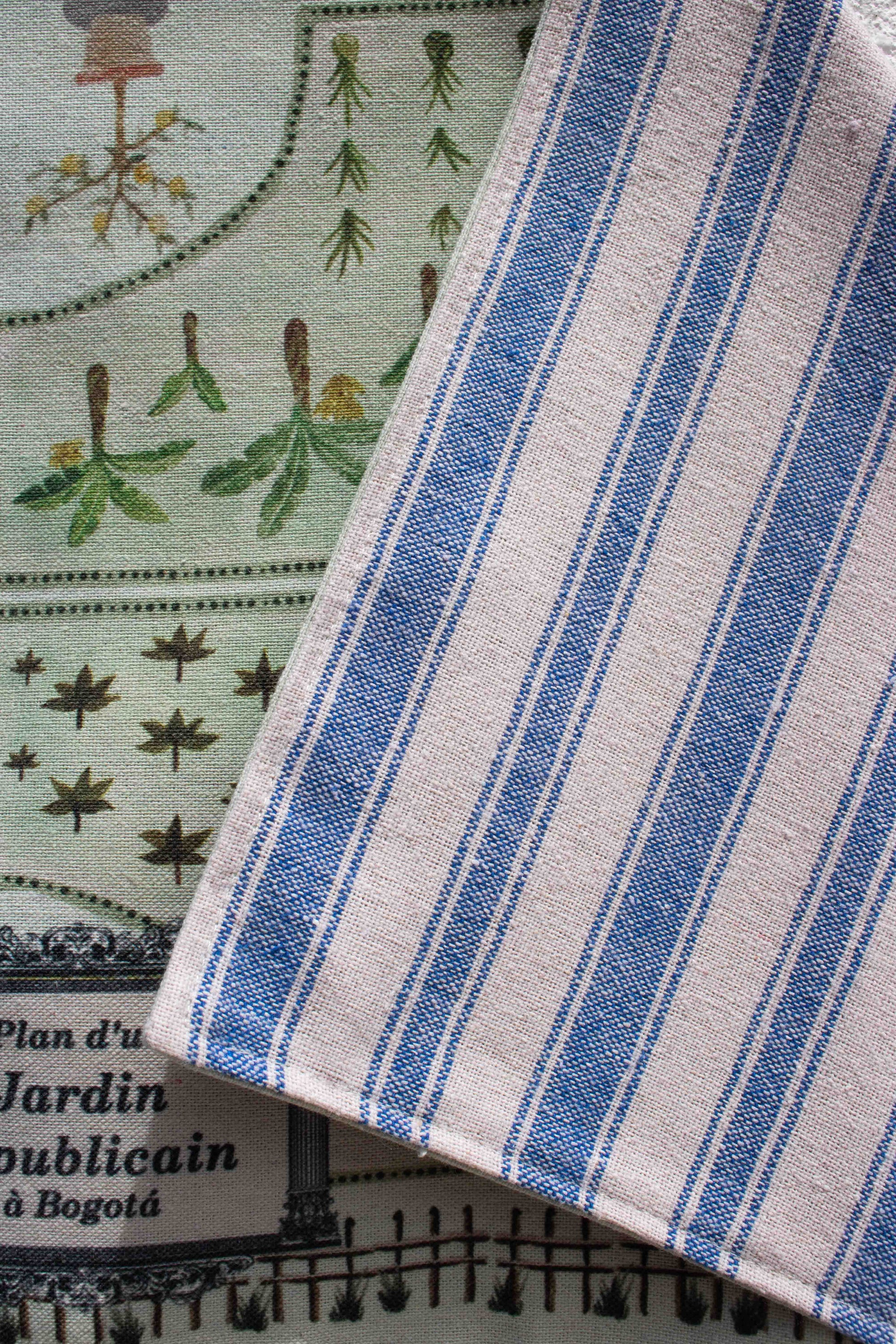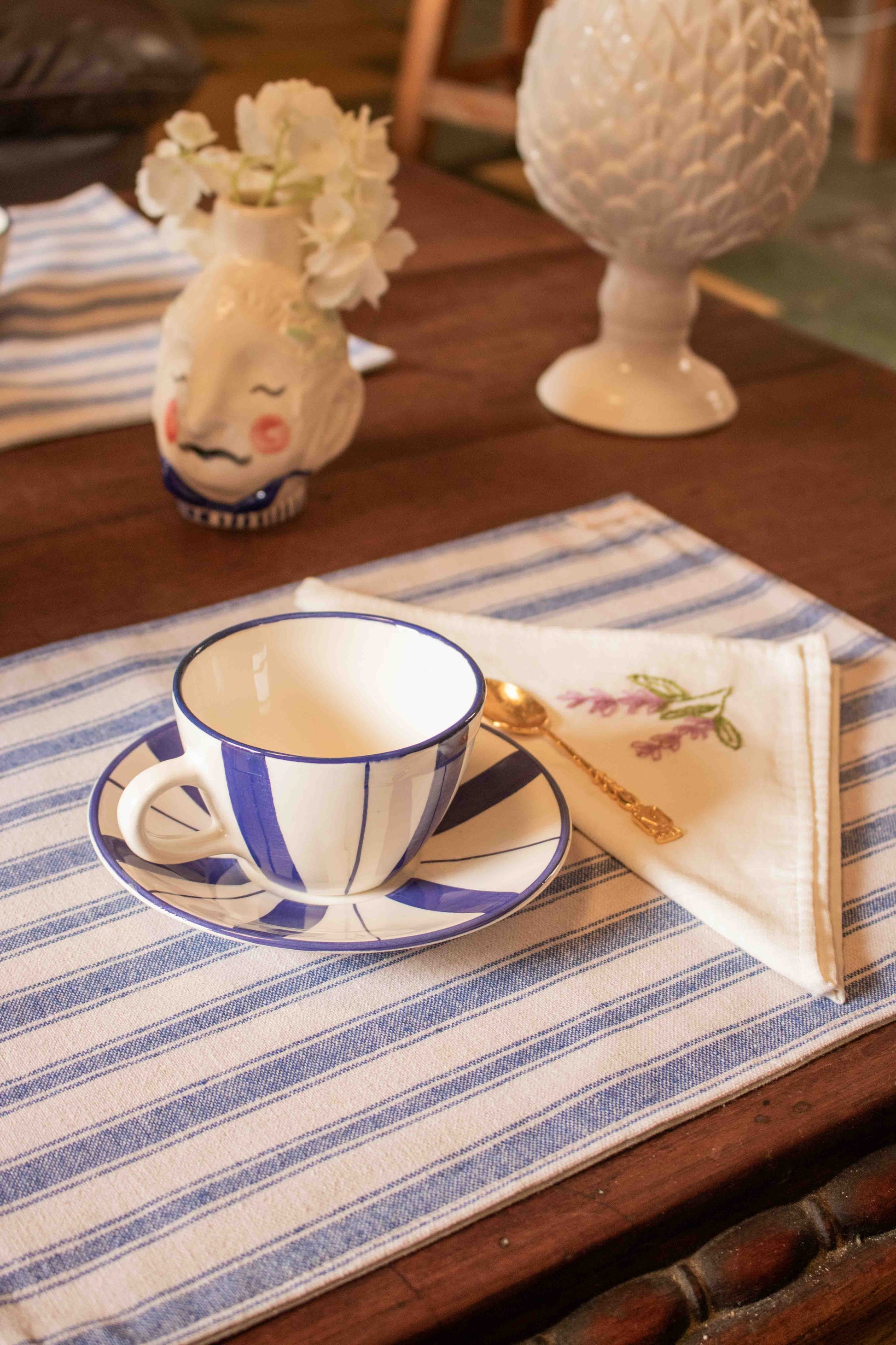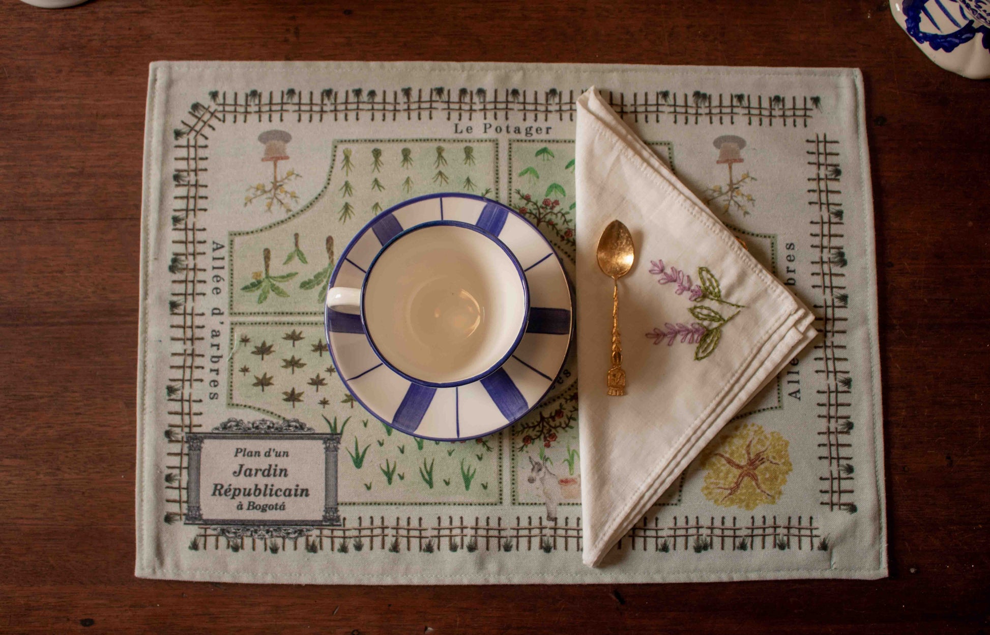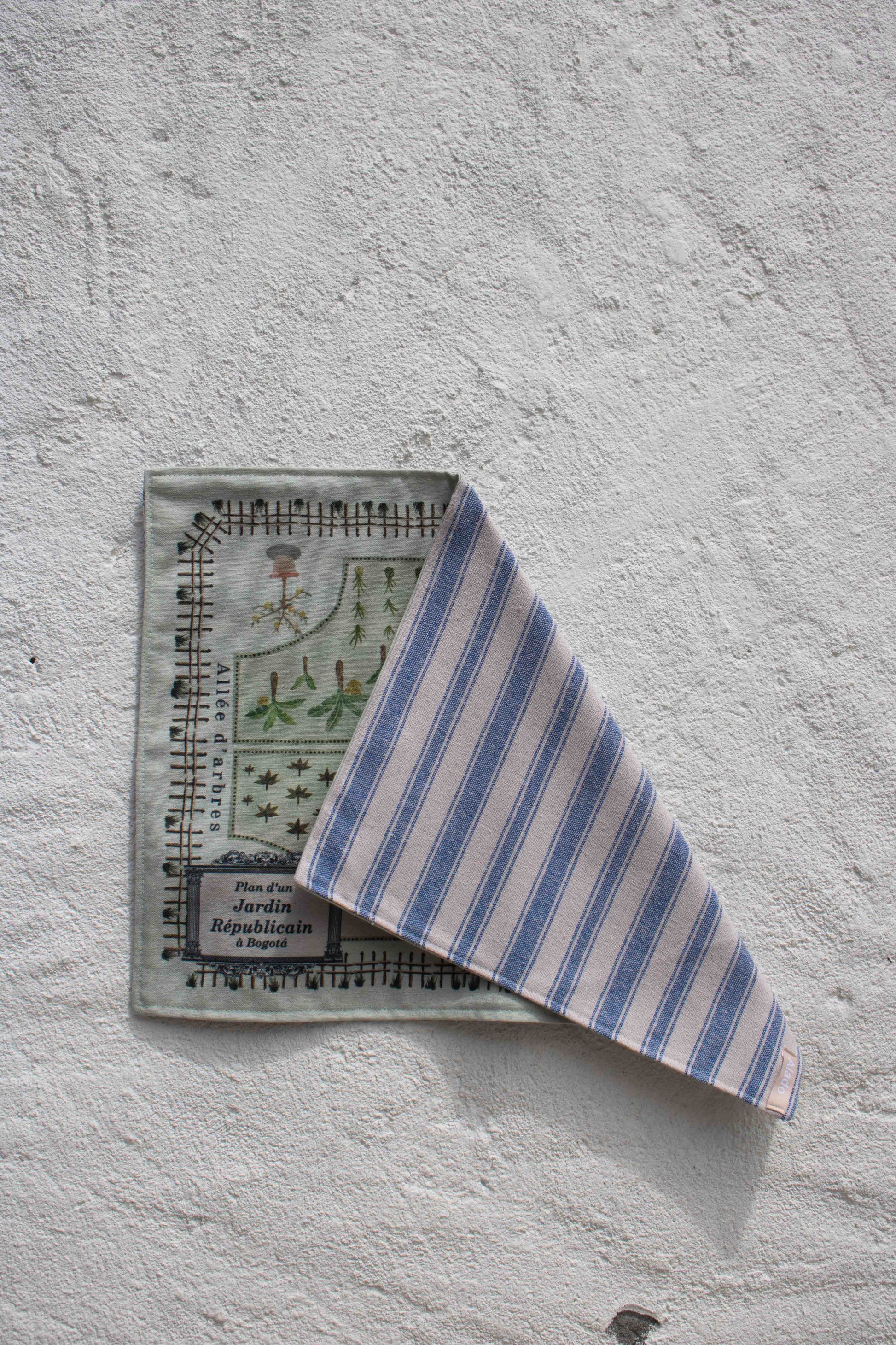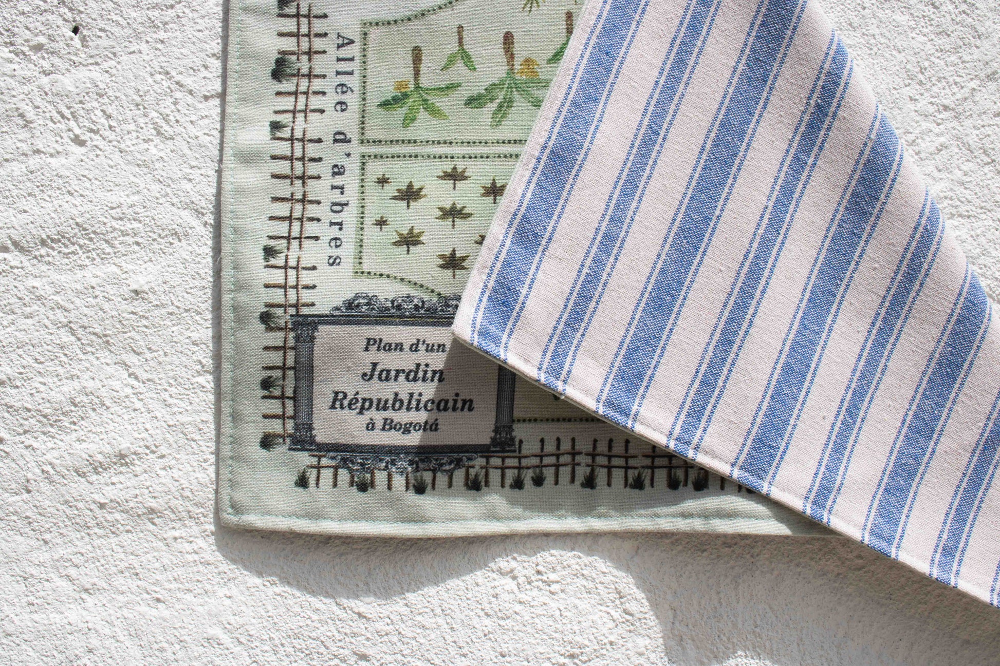 Este set de 6 individuales doble faz es una celebración del diseño colombiano, pensado para transformar la mesa en un espacio lleno de arte y significado. Por un lado, cada individual presenta nuestro gráfico exclusivo Casa Republicana con Jardín, una obra originalmente pintada a mano y llevada a la tela con técnica de sublimación. Por el otro, una versión más sobria con nuestra tela signature de rayas azules