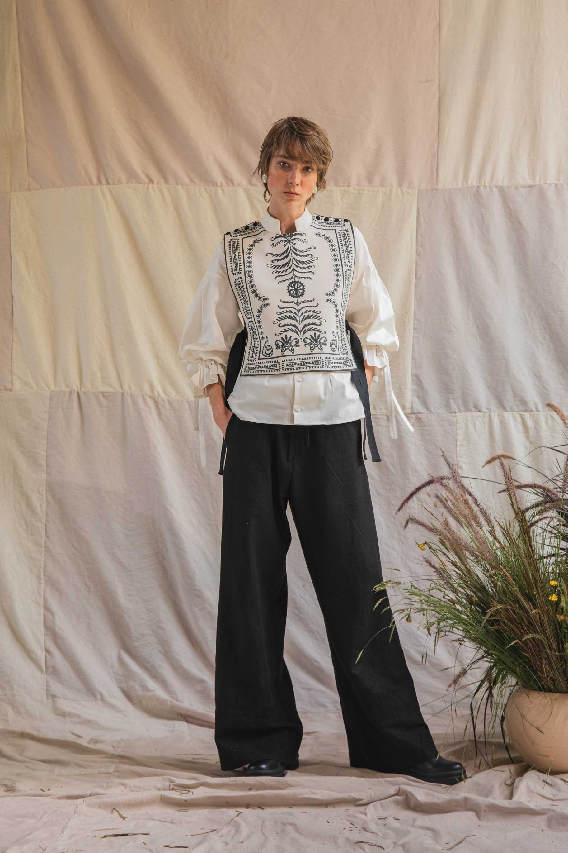 Pantalón negro de bota ancha con cierre frontal, botón en la pretina y elástico en la parte posterior de la cintura para mayor comodidad y ajuste. Una prenda versátil que combina estructura y flexibilidad, ideal para elevar cualquier look con un aire contemporáneo.