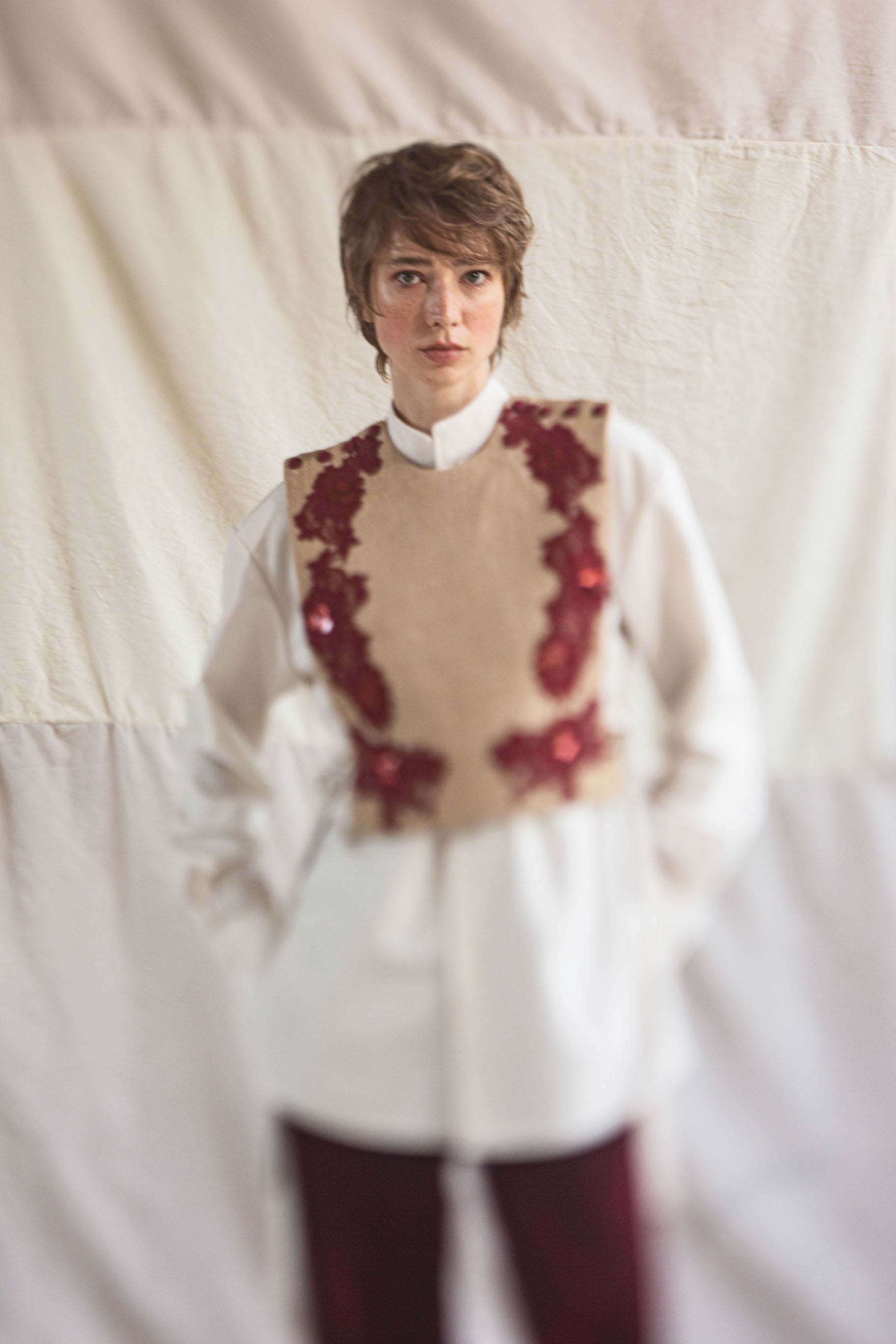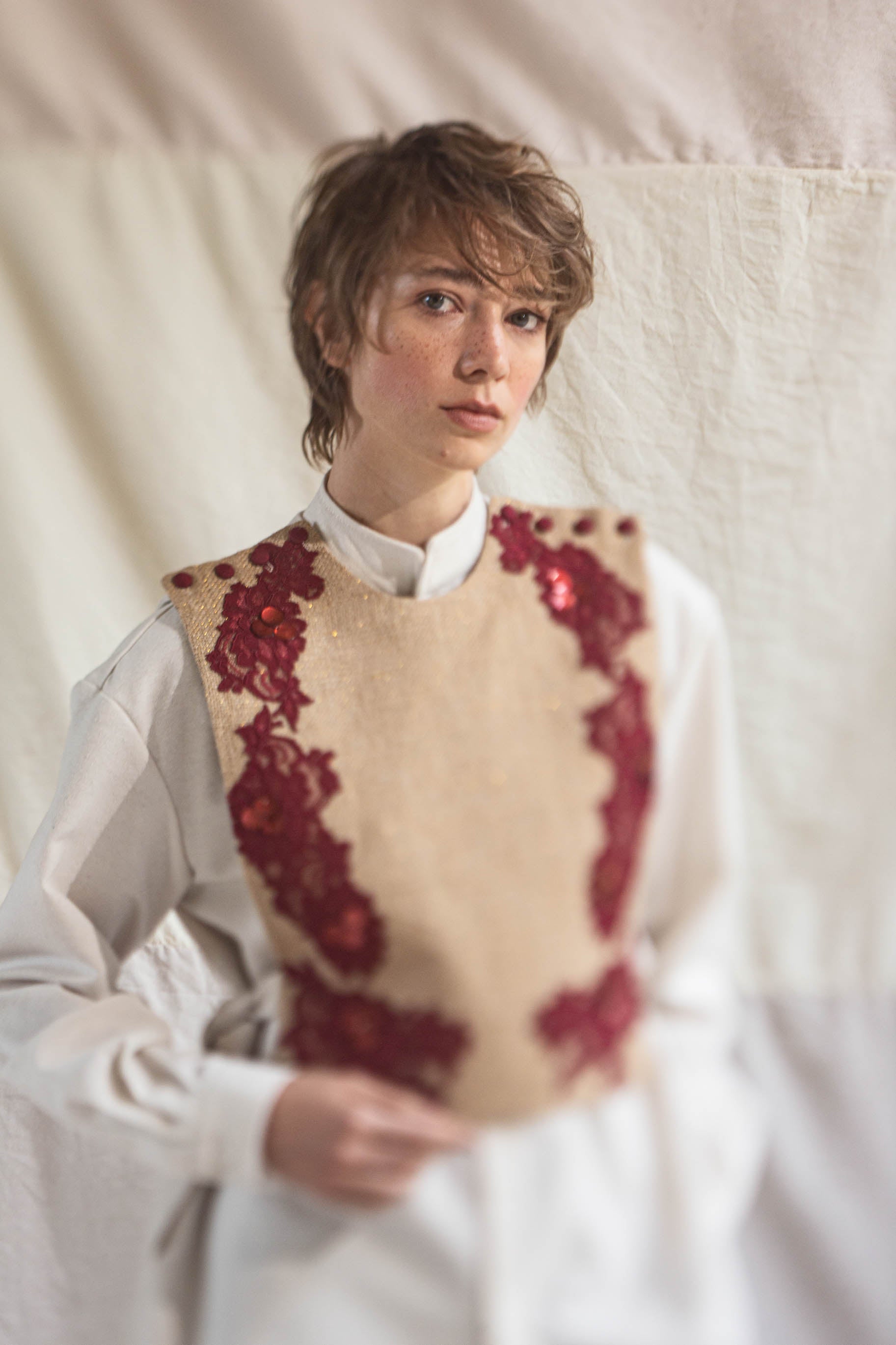 Peto/chaleco de dos piezas en fique forrado, silueta recta, cierre con botones en los hombros y tiras laterales, apliques rojos y bordados a mano