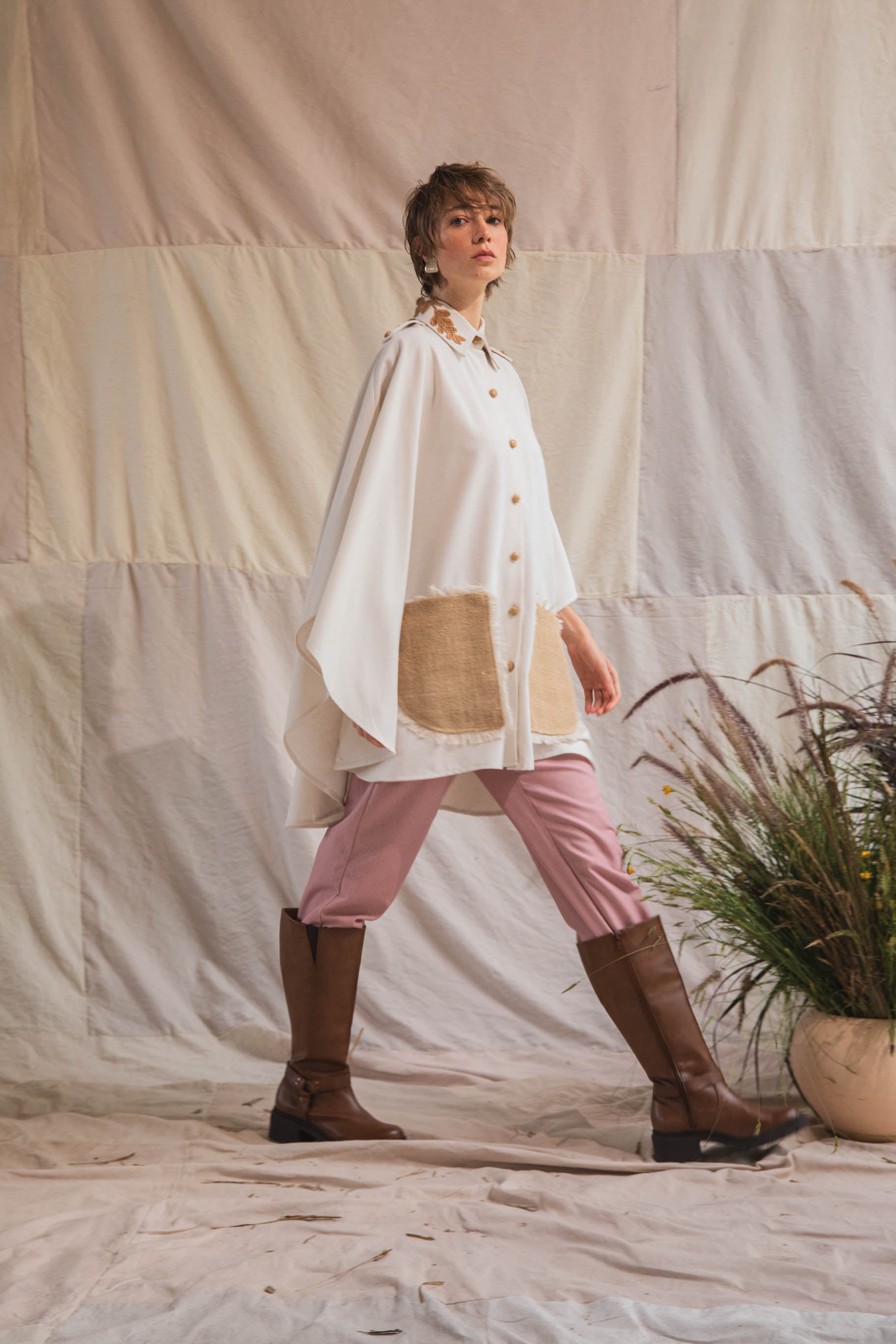 Ruana/Poncho con cierre de botones, charreteras en los hombros, apliques color café en el cuello y bolsillos en tela de fique.