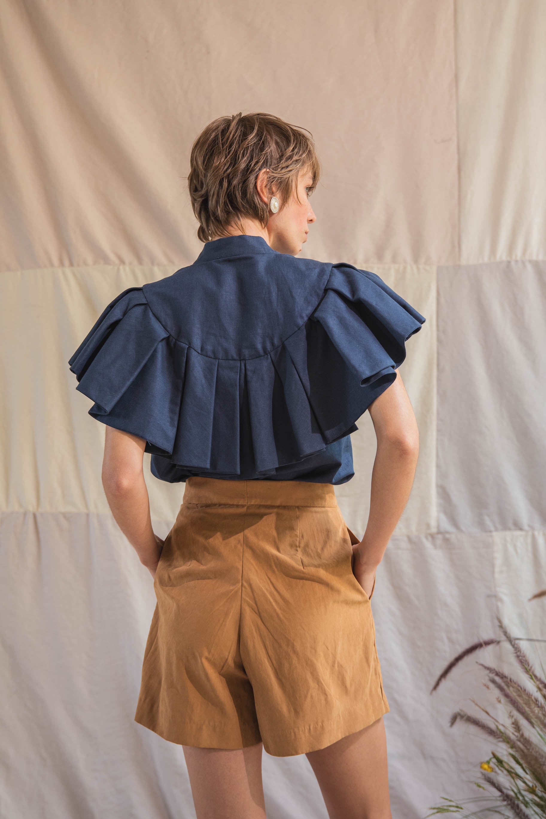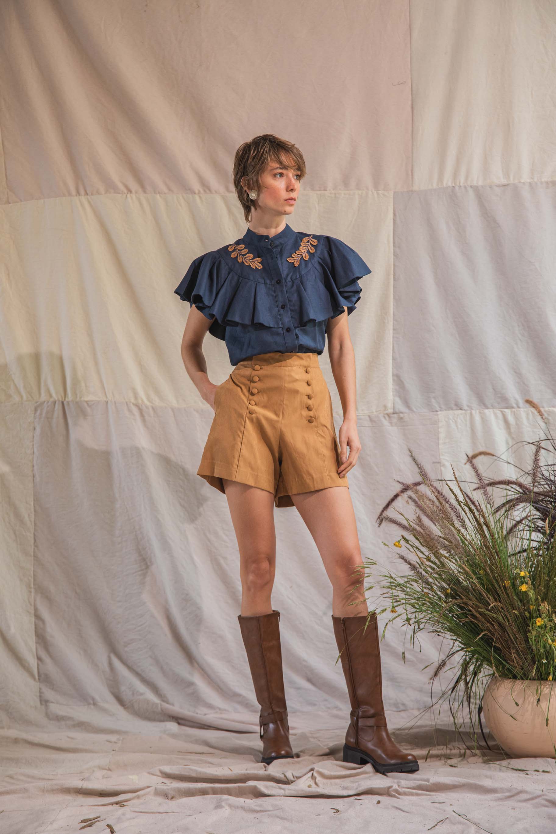 Short amplio de tiro alto, con pretina de botón y botones decorativos forrados en el frente.