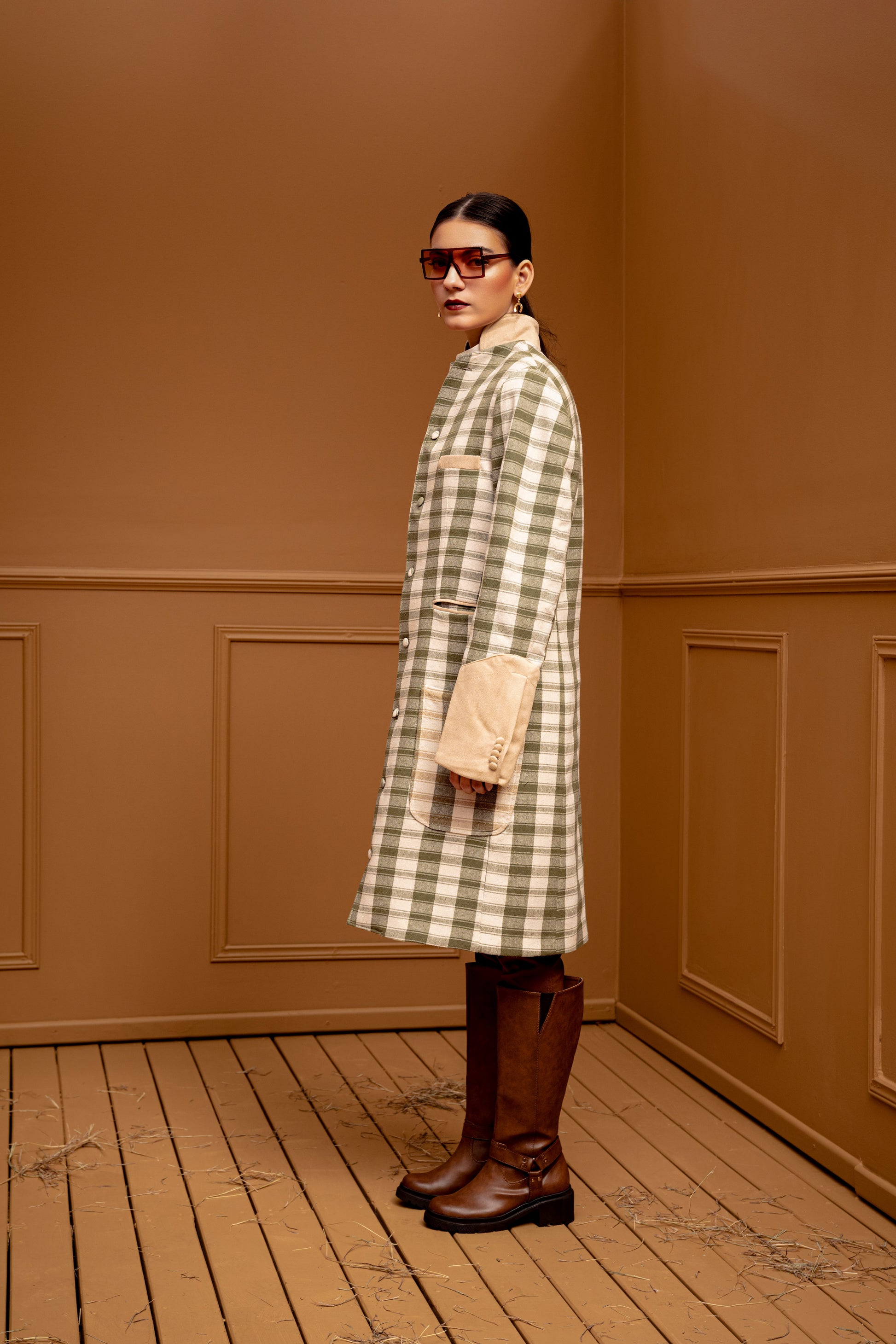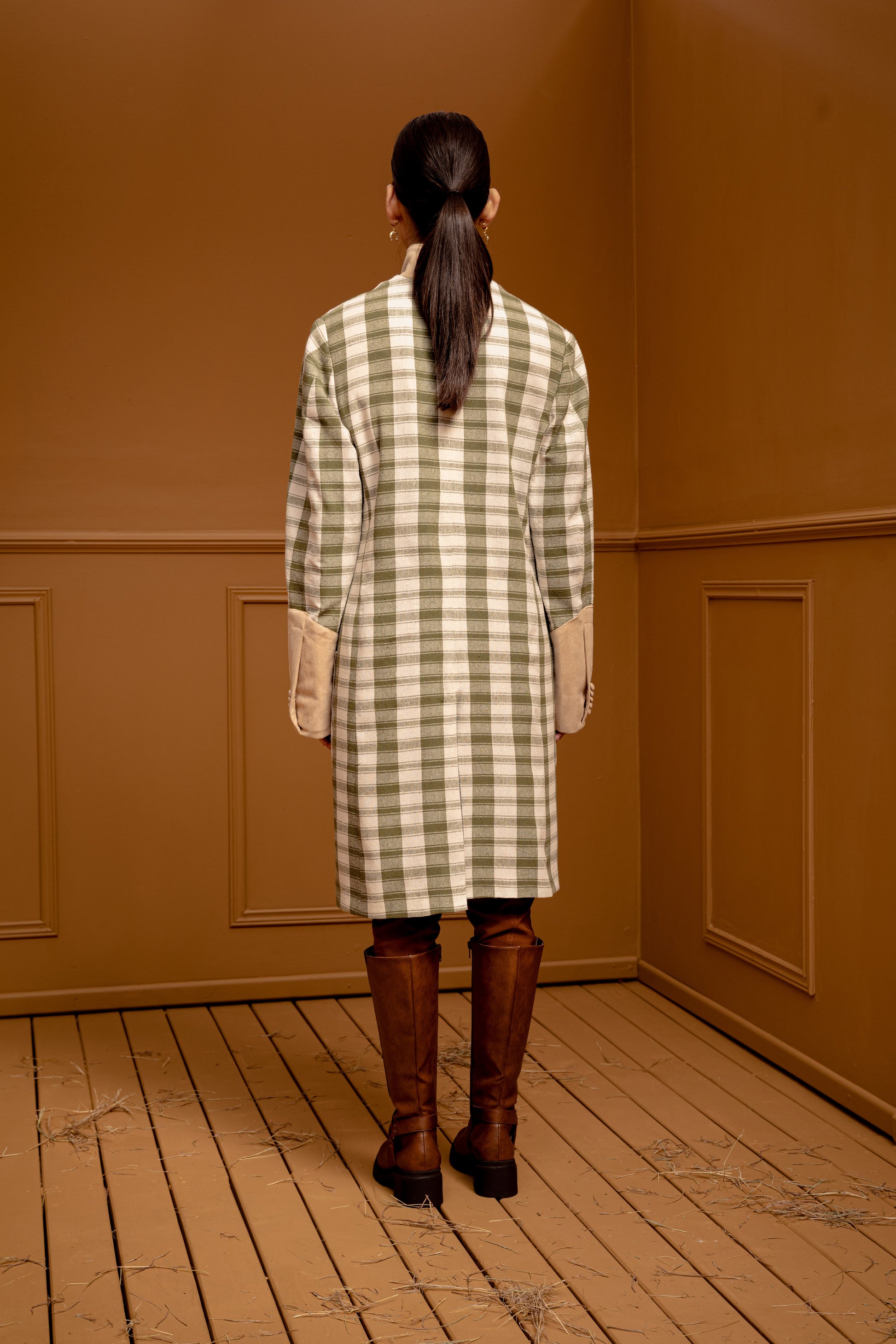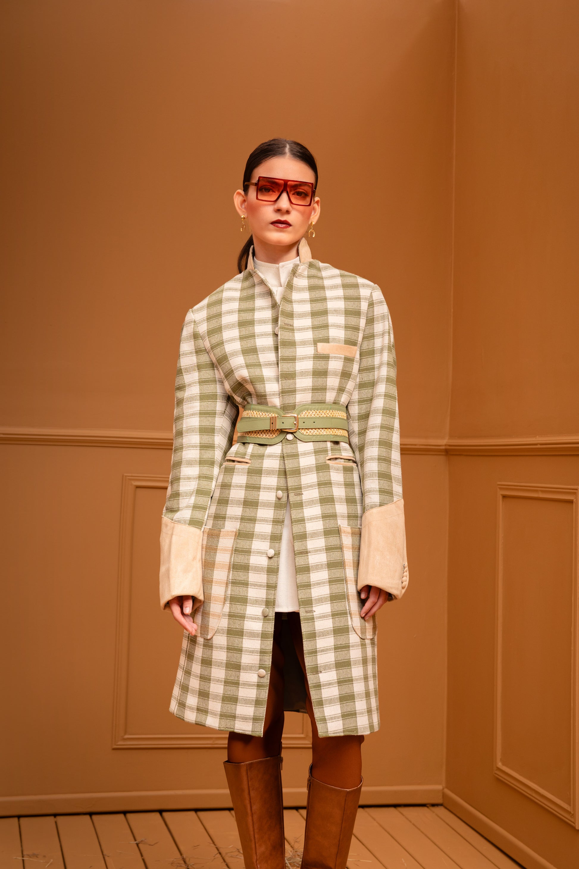Gabán largo en tejido artesanal de cuadros verde y crudo, con estructura recta y cuello tipo mao. Presenta amplios puños en contraste elaborados en gamuza clara y un bolsillo superior decorativo en el pecho. Se ajusta en la cintura con un cinturón tejido con aplicaciones metálicas que resalta la silueta. Está completamente forrado y cuenta con bolsillos interiores funcionales.