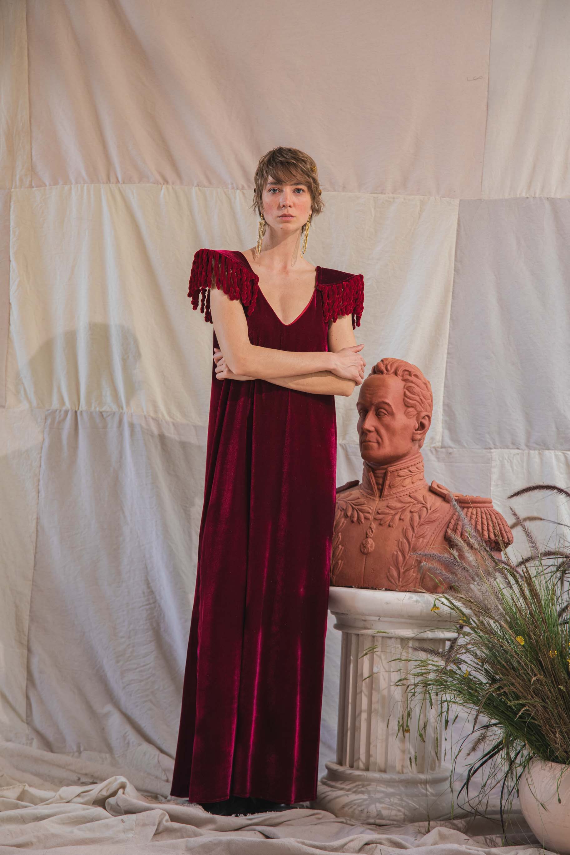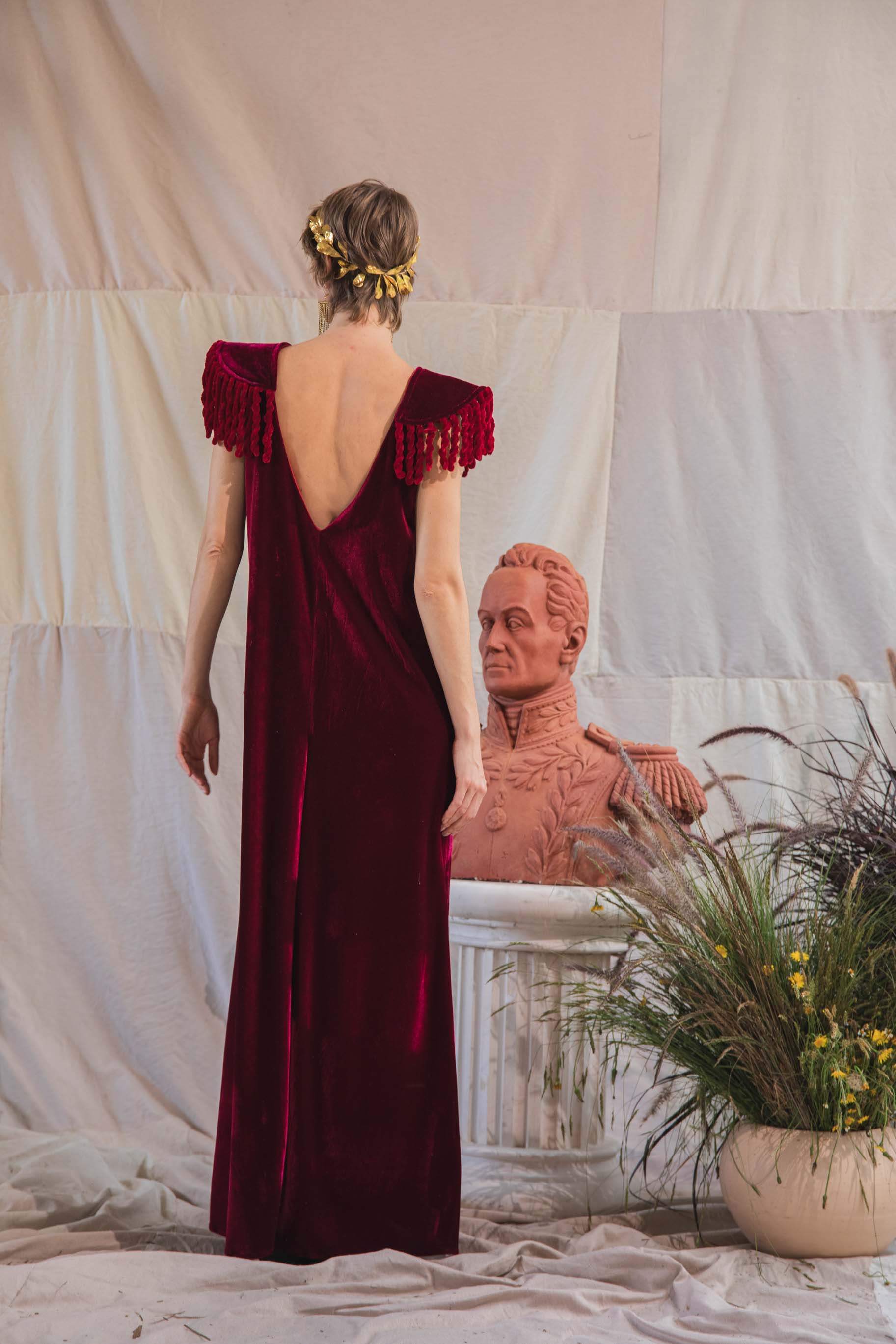 Vestido tipo talego largo y recto, con escote profundo en pecho y espalda. Hombreras decoradas con apliques y flecos.