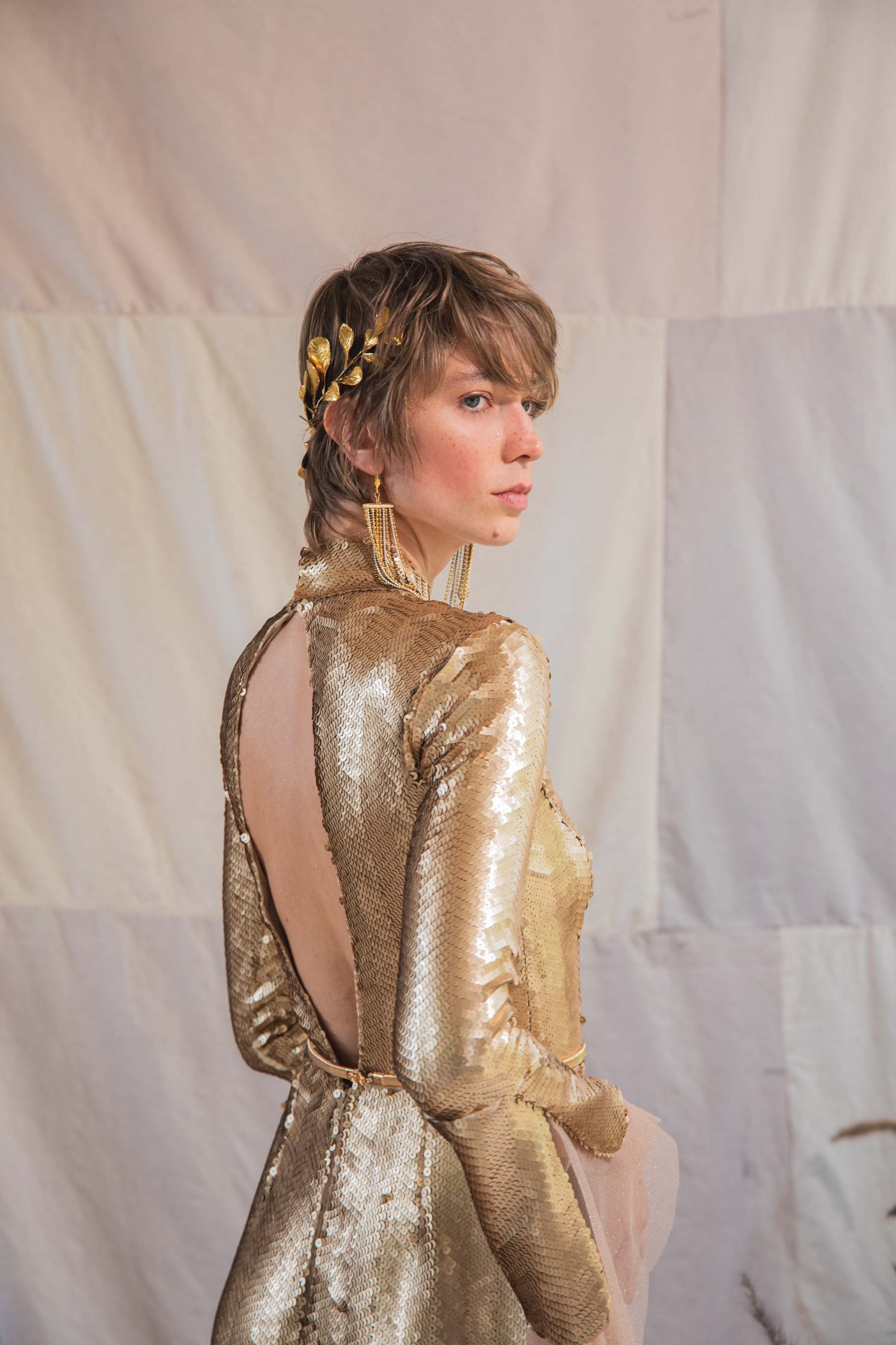 Vestido largo con mangas largas, fabricado en tela de lentejuelas, con mangas de boleros. Ceñido en la cintura, completamente dorado, y con tela de encaje en los puños para darle volumen. Incluye un cinturón dorado ajustable, tiene cuello alto y escote en la espalda.