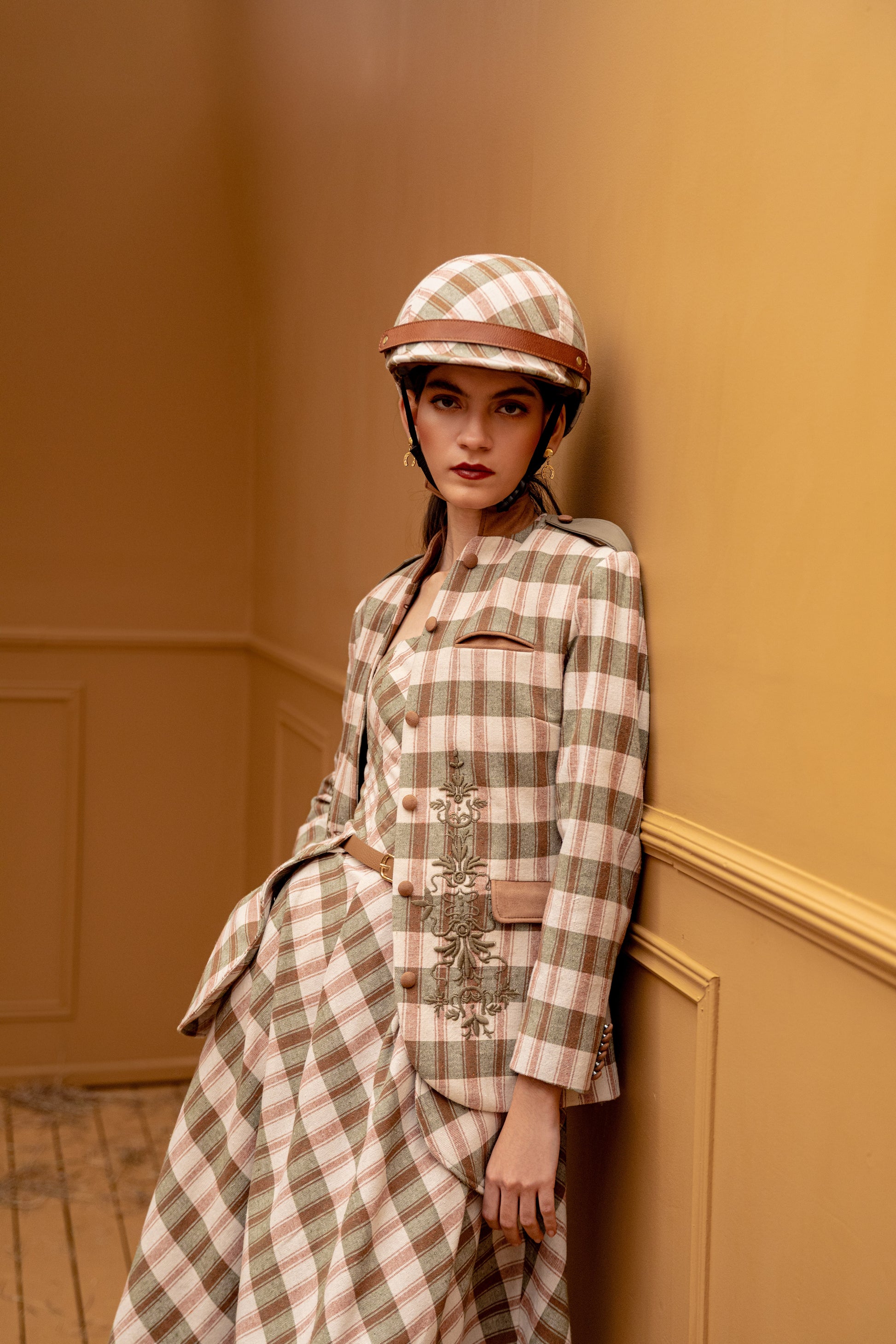 Vestido largo con cuerpo tipo corsé y escote strapless que realza la estructura del busto. La falda tipo A tiene una silueta asimétrica —más corta al frente y más larga atrás— que termina en boleros. En la cintura los bolsillos son desmontables tipo solapa que aportan un detalle funcional al diseño.